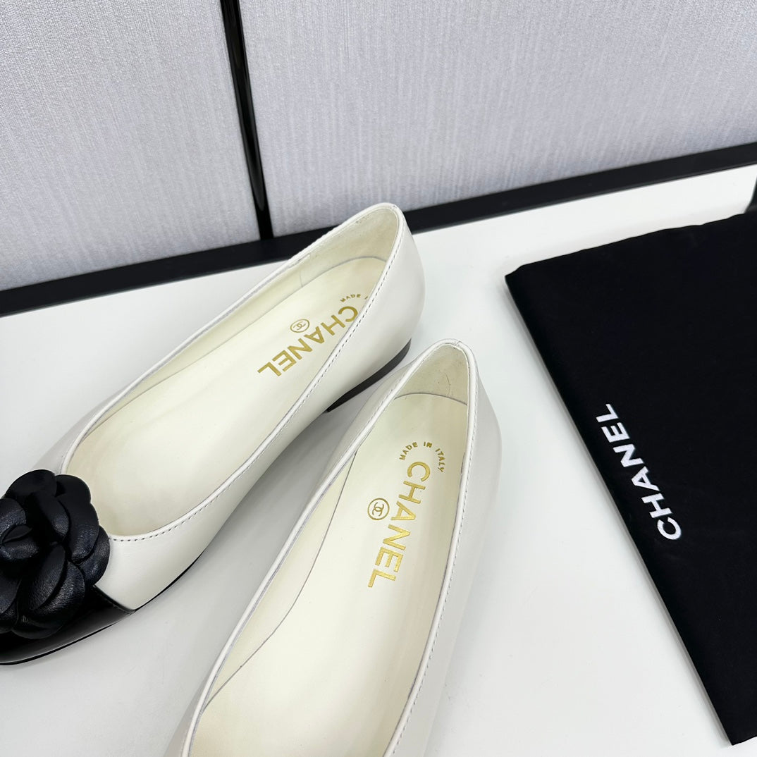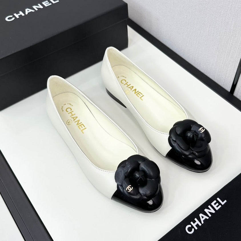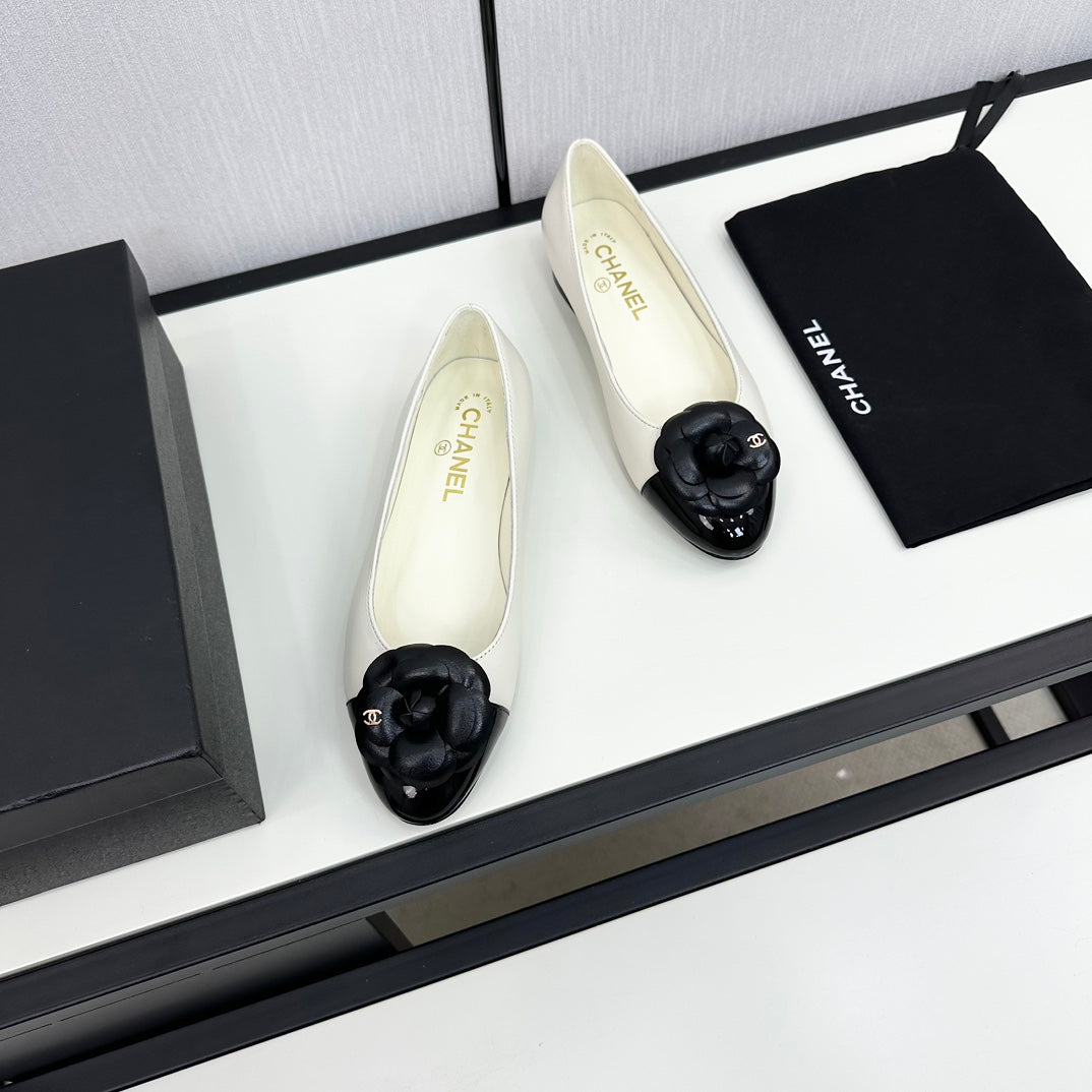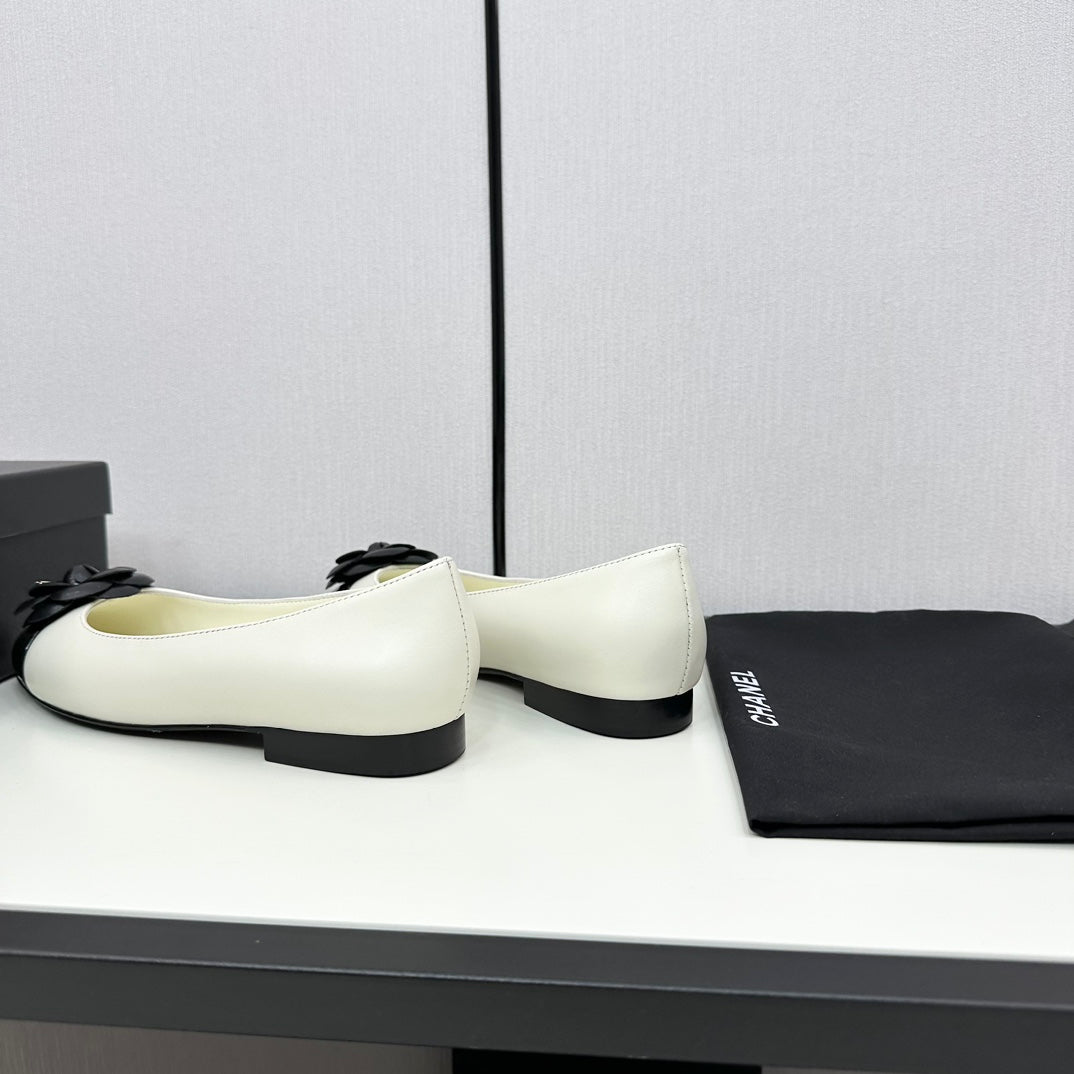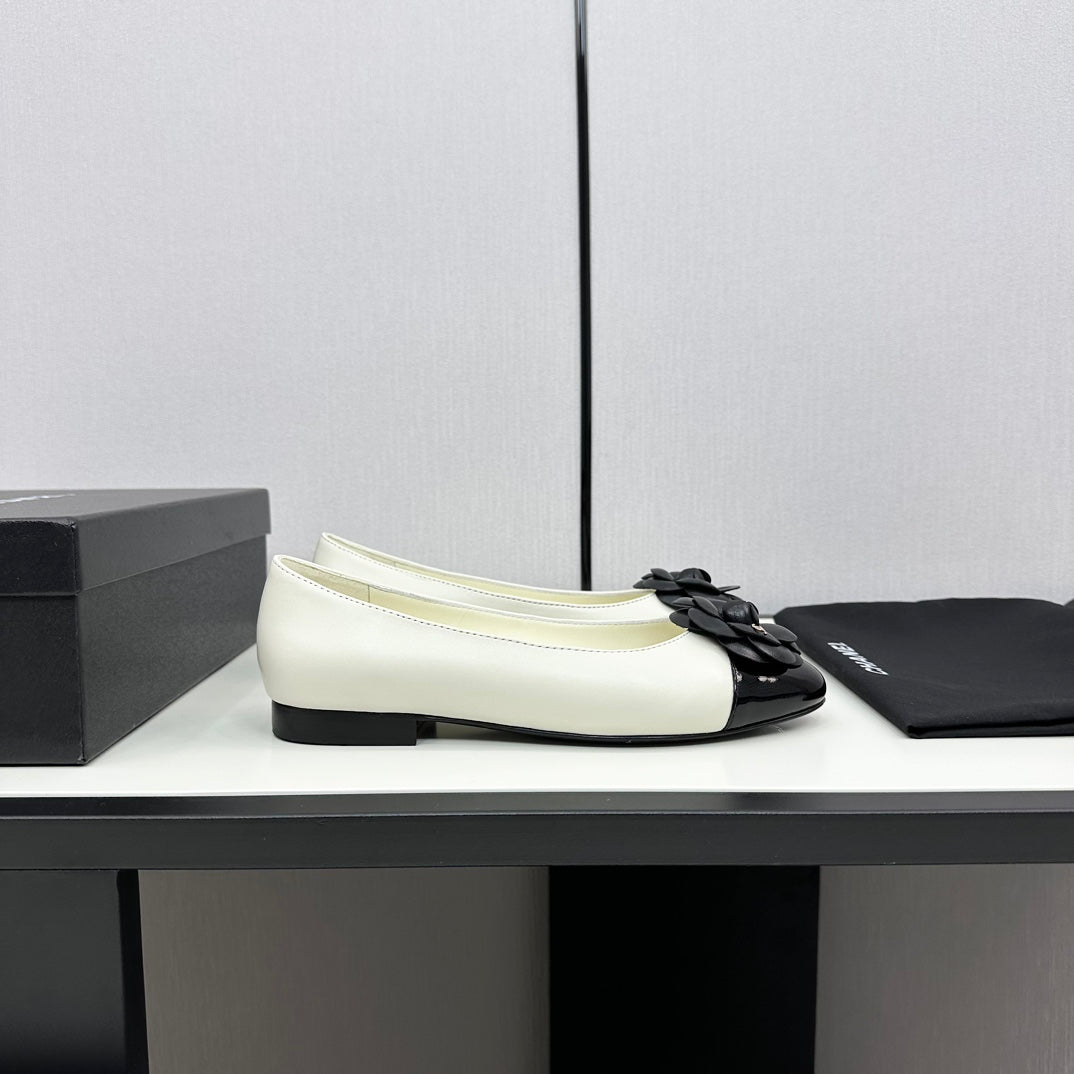 ballet flat flower cream calfskin black patent calfskin
