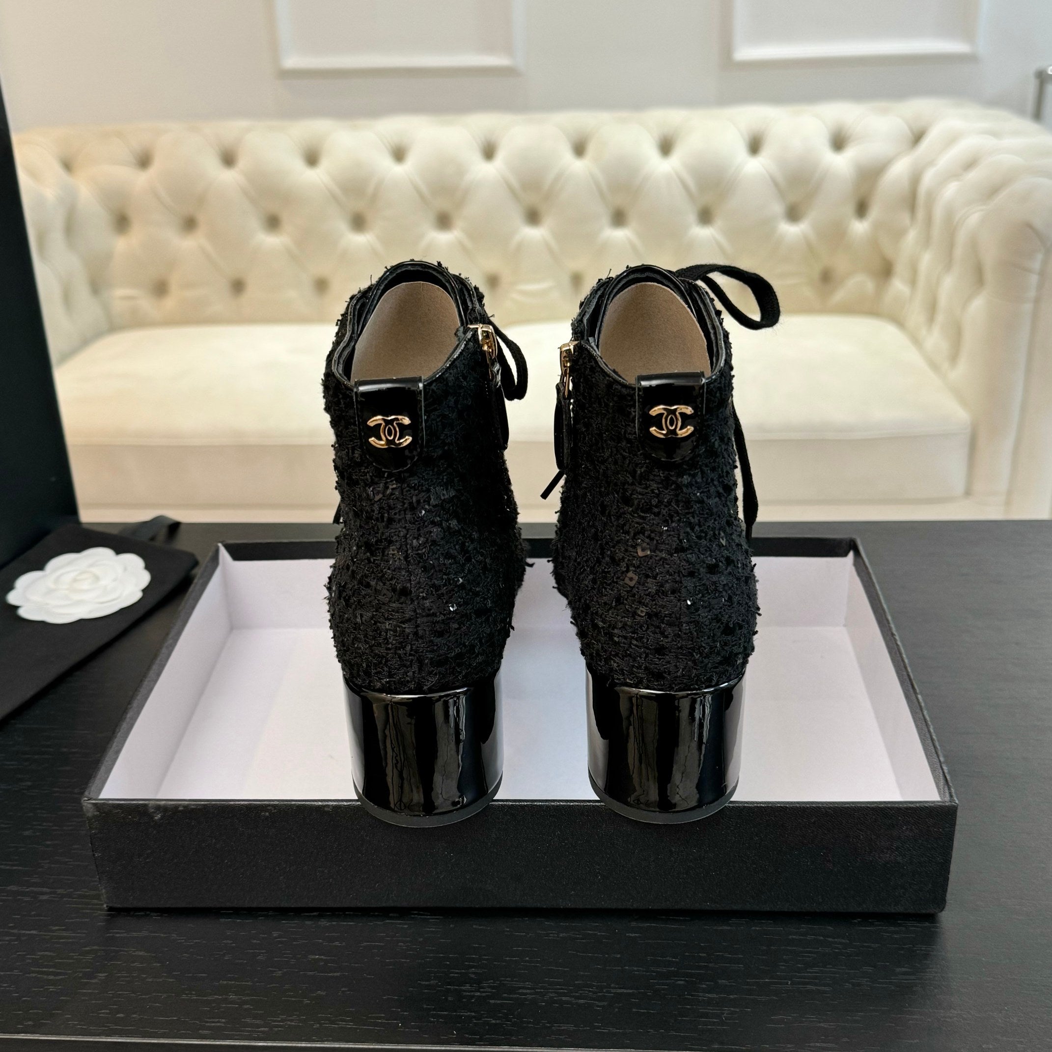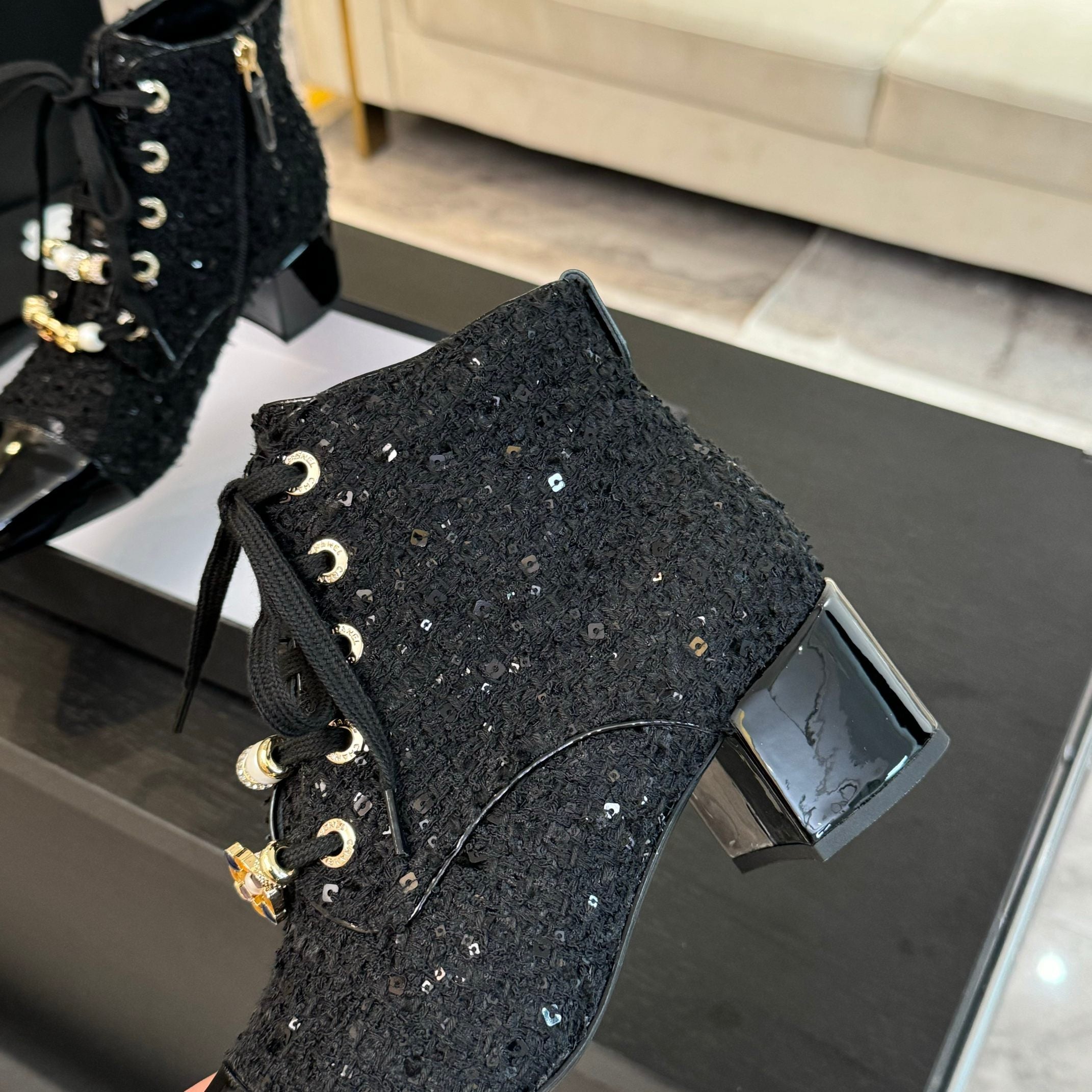 CC Ankle Boots Black Beaded Tweed Fabric And Lambskin