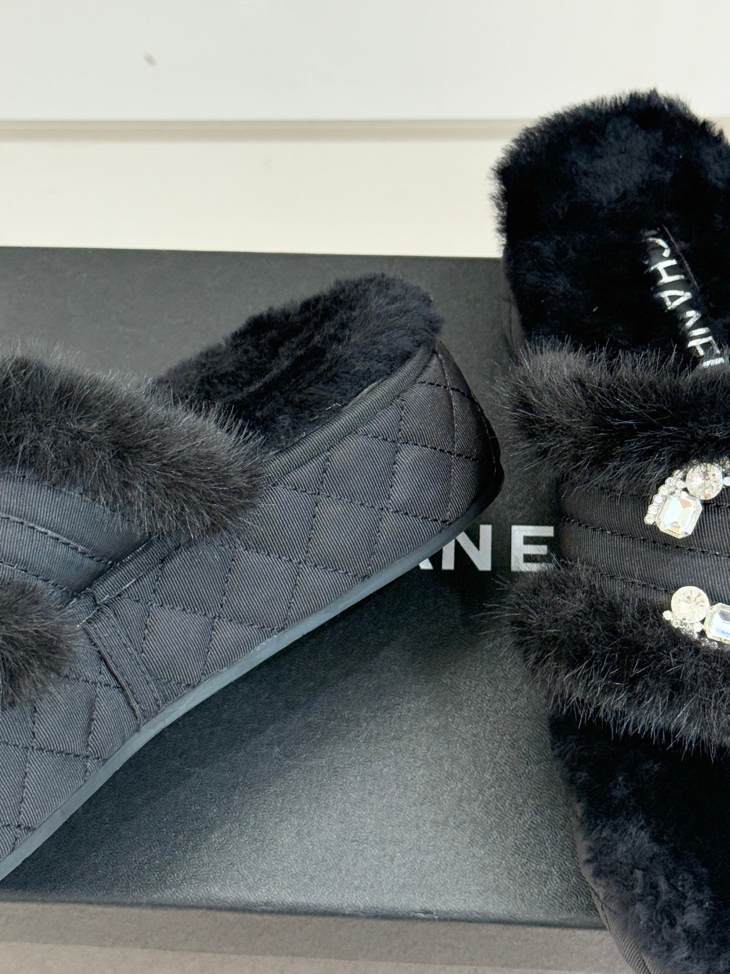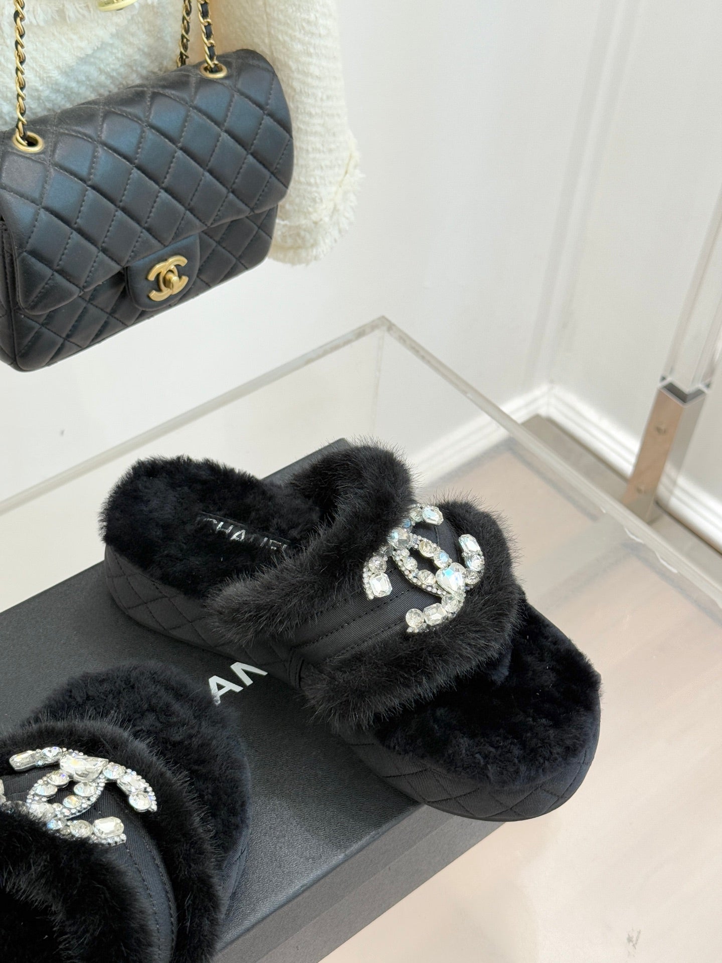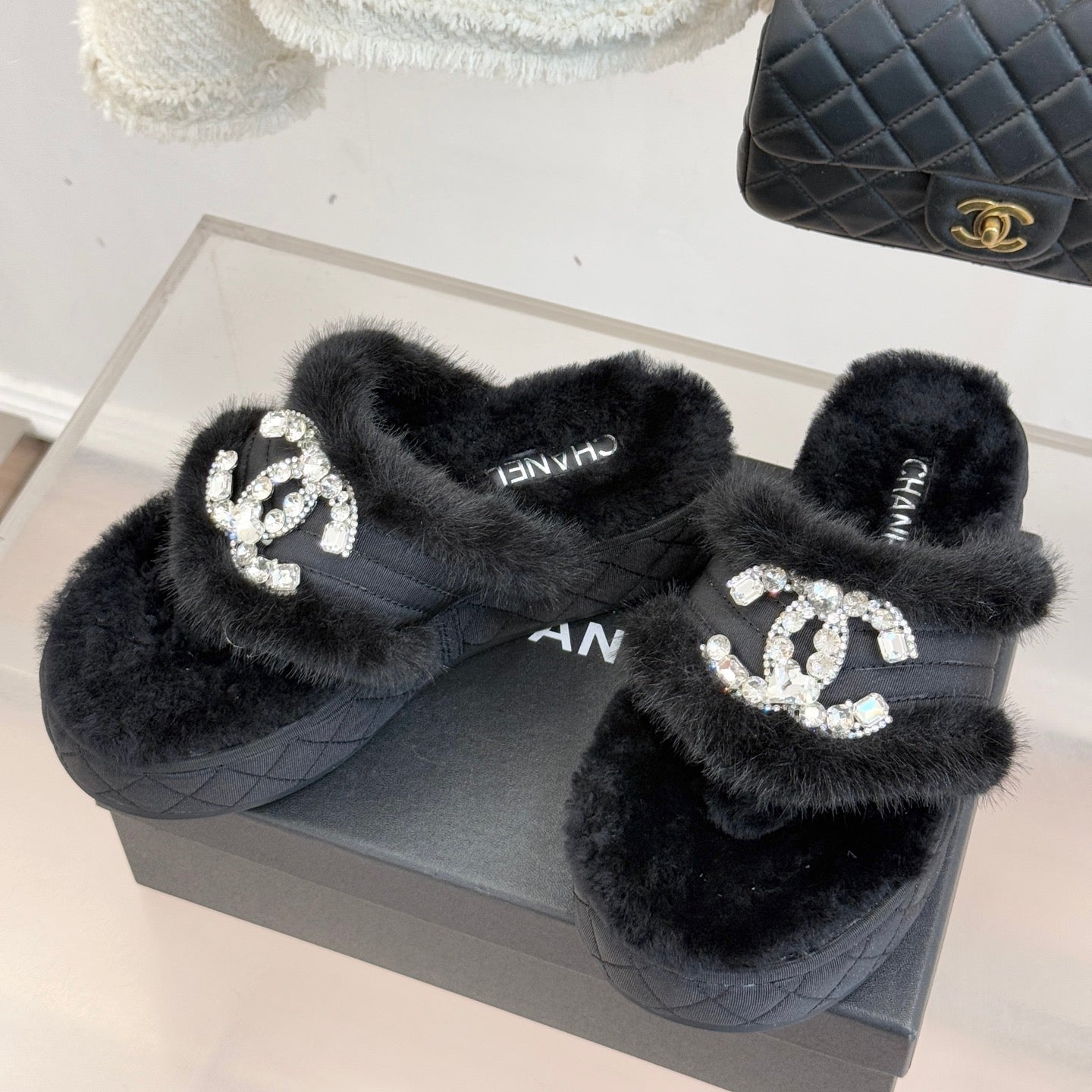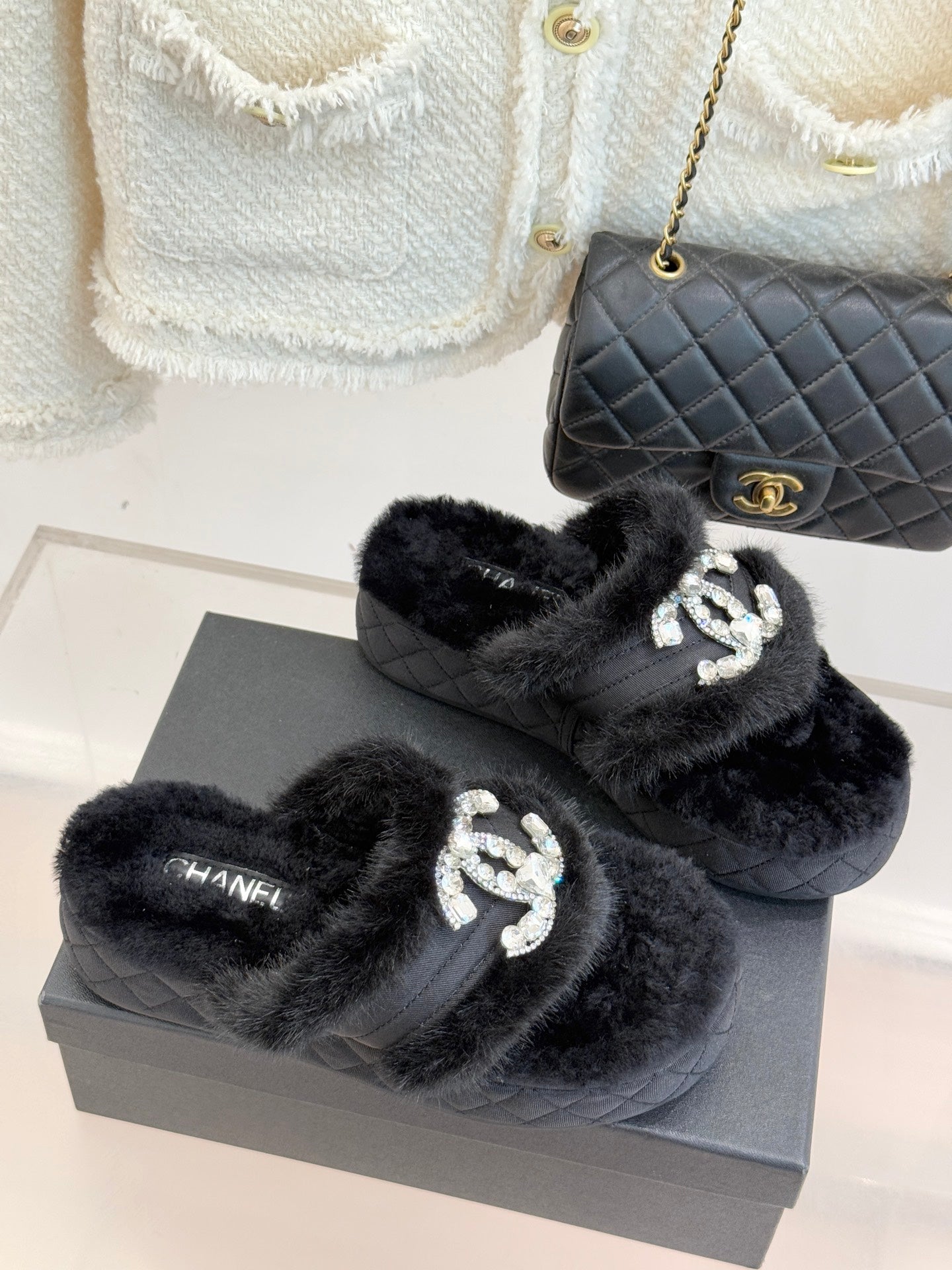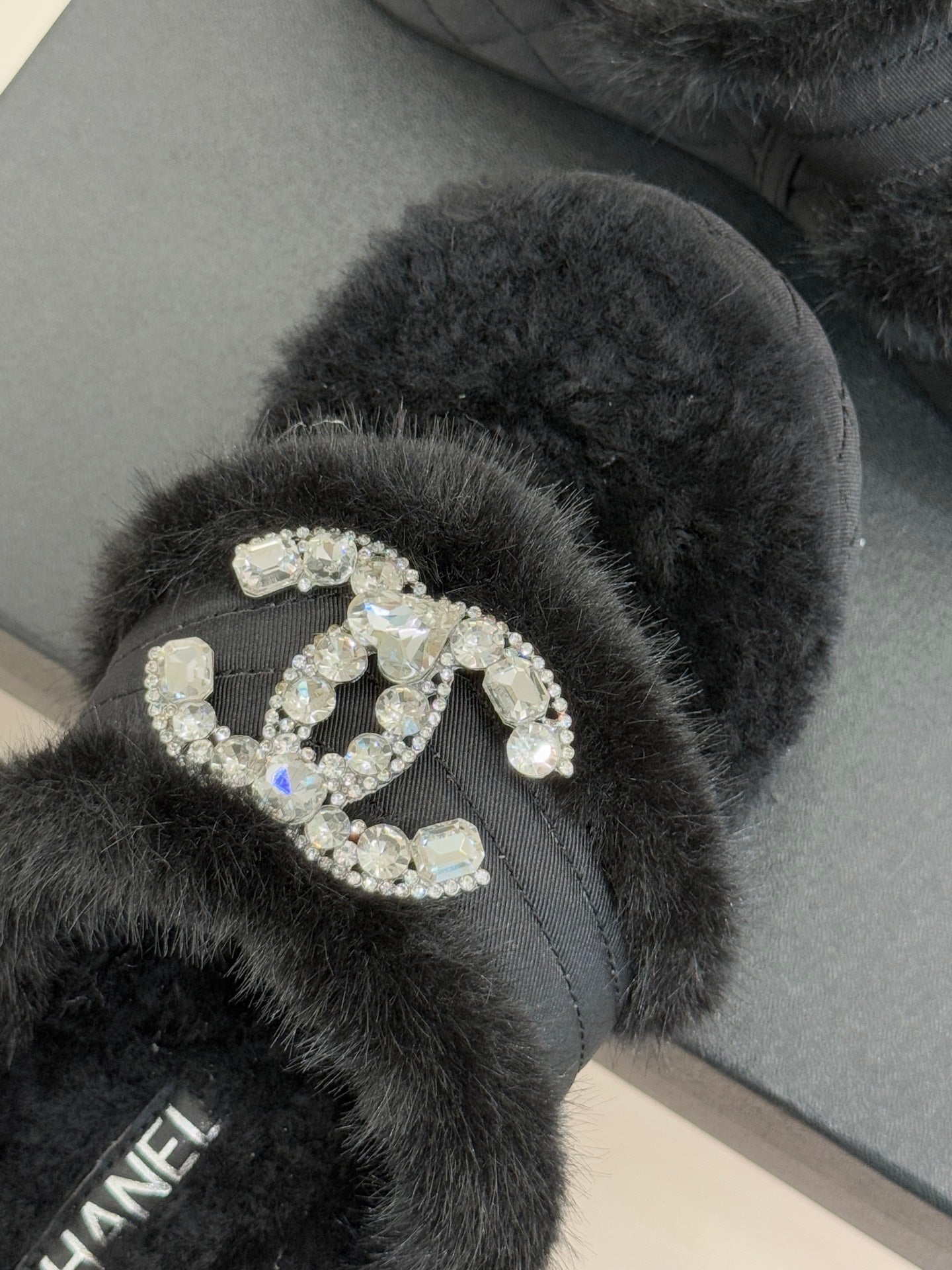 CC slipper double C rhinestone buckle black wool 512051