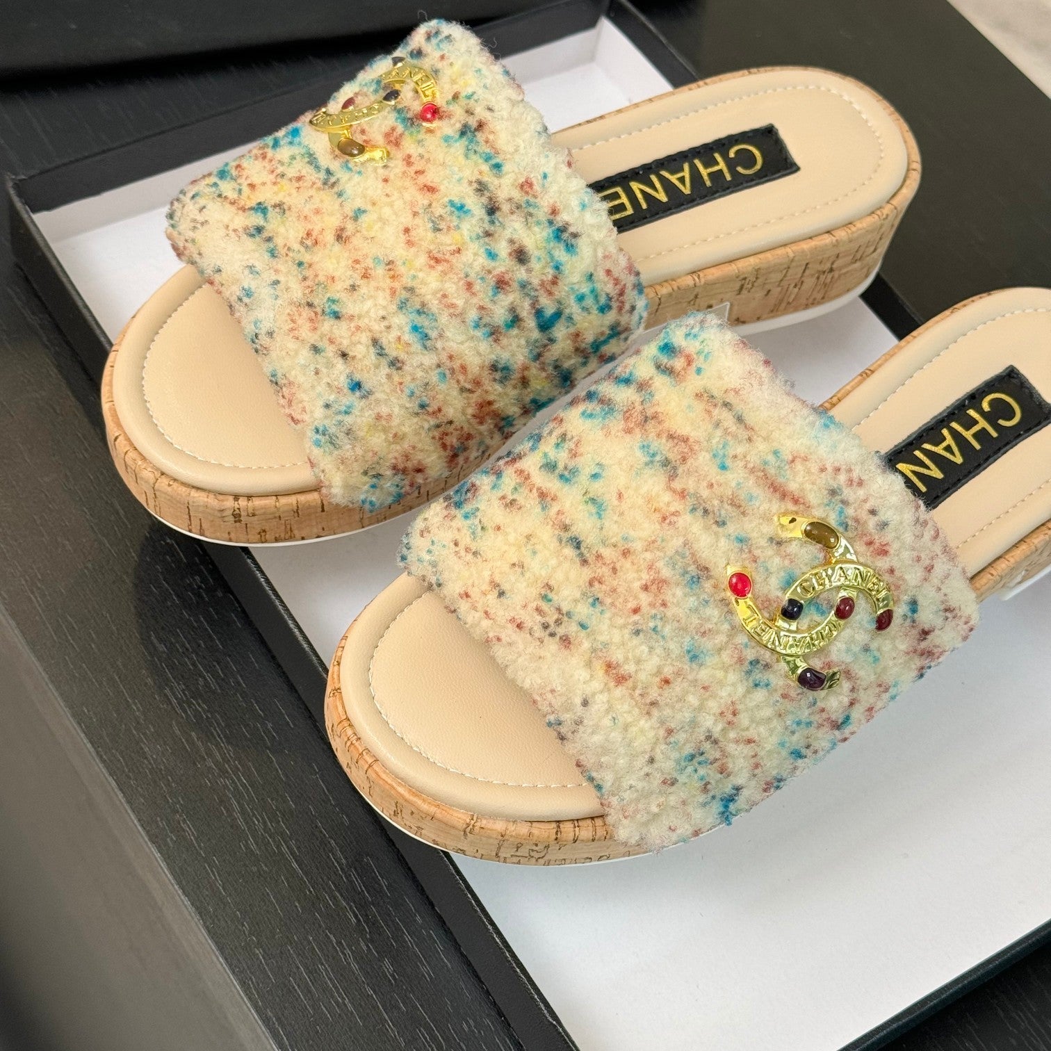 CC Slippers Beige Mix Blue Red Wool And Calfskin