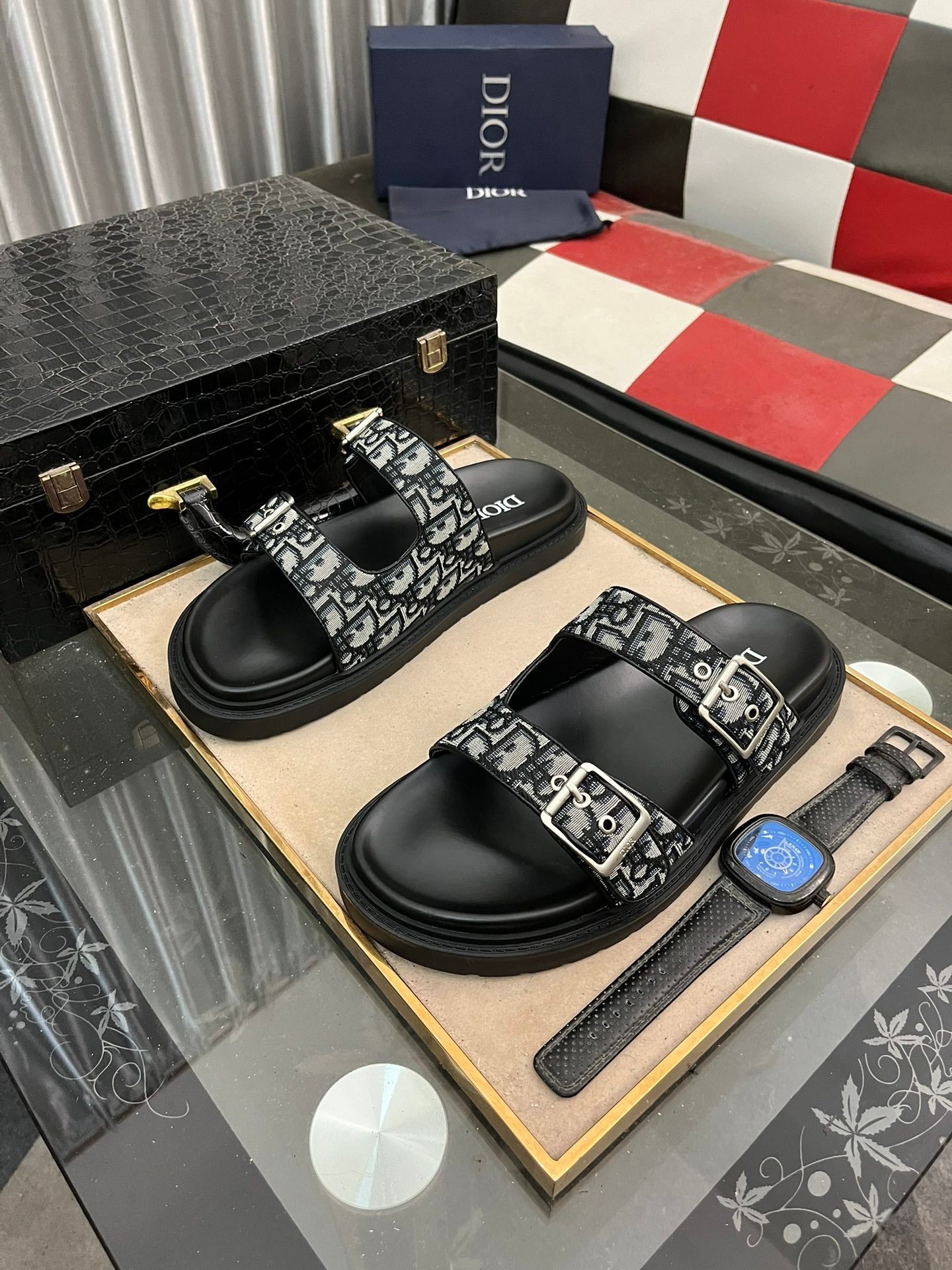 CD AQUA BUCKLE SANDAL BLACK AND GRAY JACQUARD