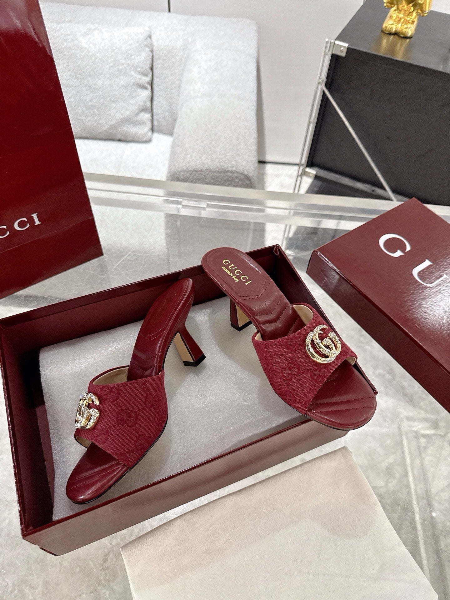 GC 2025 Double G High Heel Sandals Red Canvas Sheepskin 292467