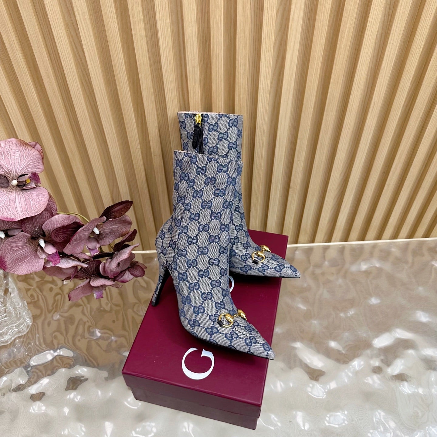 Gucci 2025 Thick-heeled Square-toed Ankle Boots Blue Sheepskin Fabric 498065