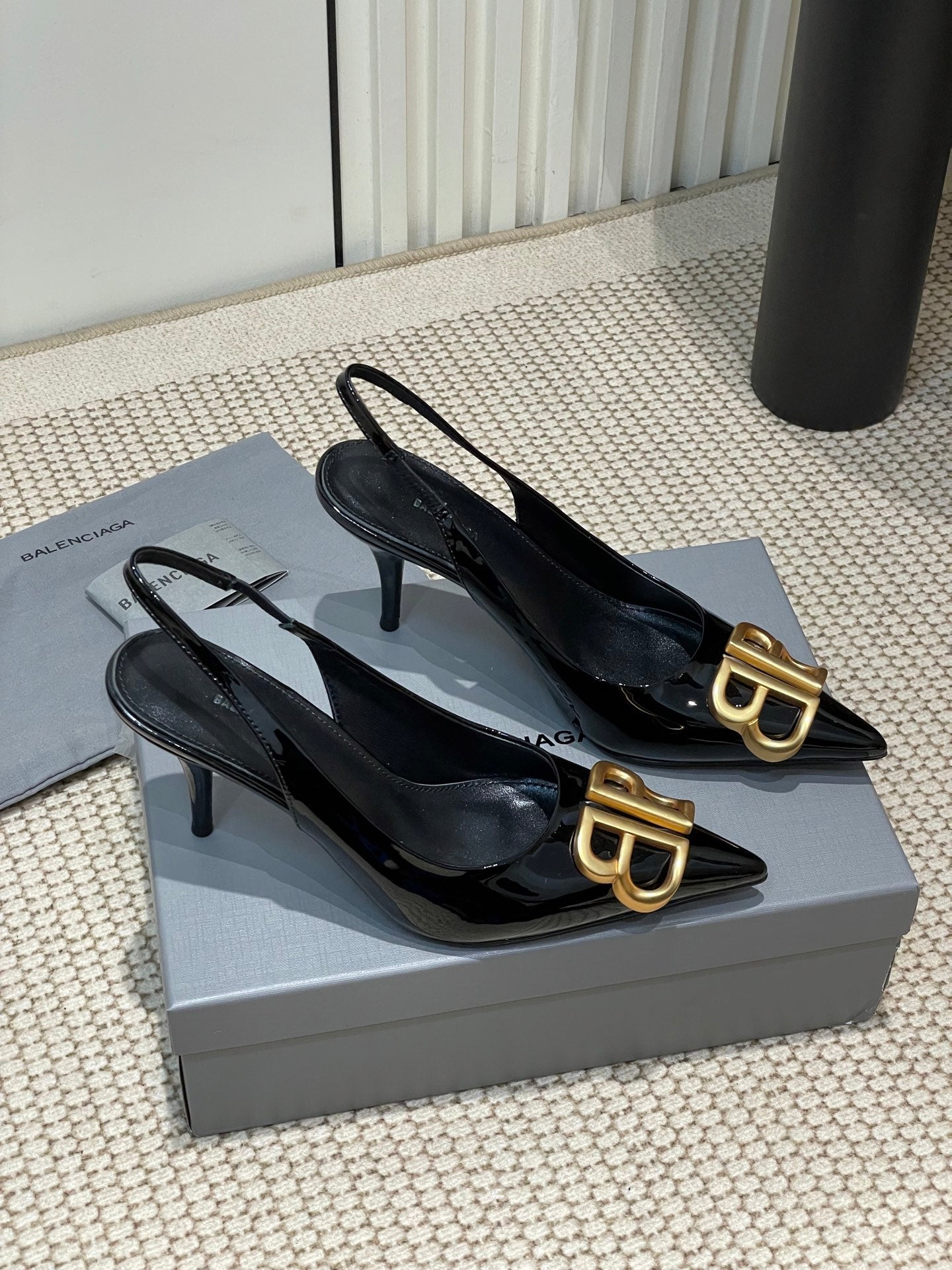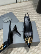 POINTED BB GOLD BUCKLE HIGH SLINGBACK 80MM IN BLACK PATENT CALFSKIN