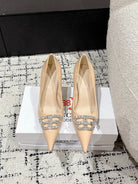 POINTED HIGH PUMPS IN LUXE BEIGE PATENT CALFSKIN WITH CRYSTAL BUCKLE