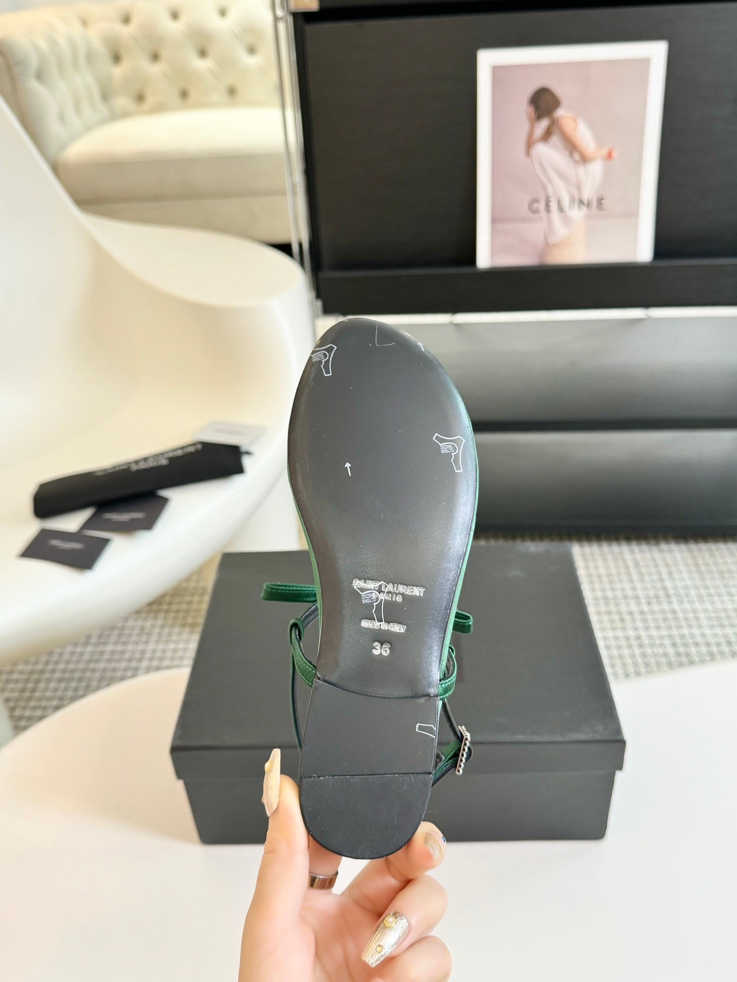 SL Silk Bow T-Strap Flat Sandals Green Leather