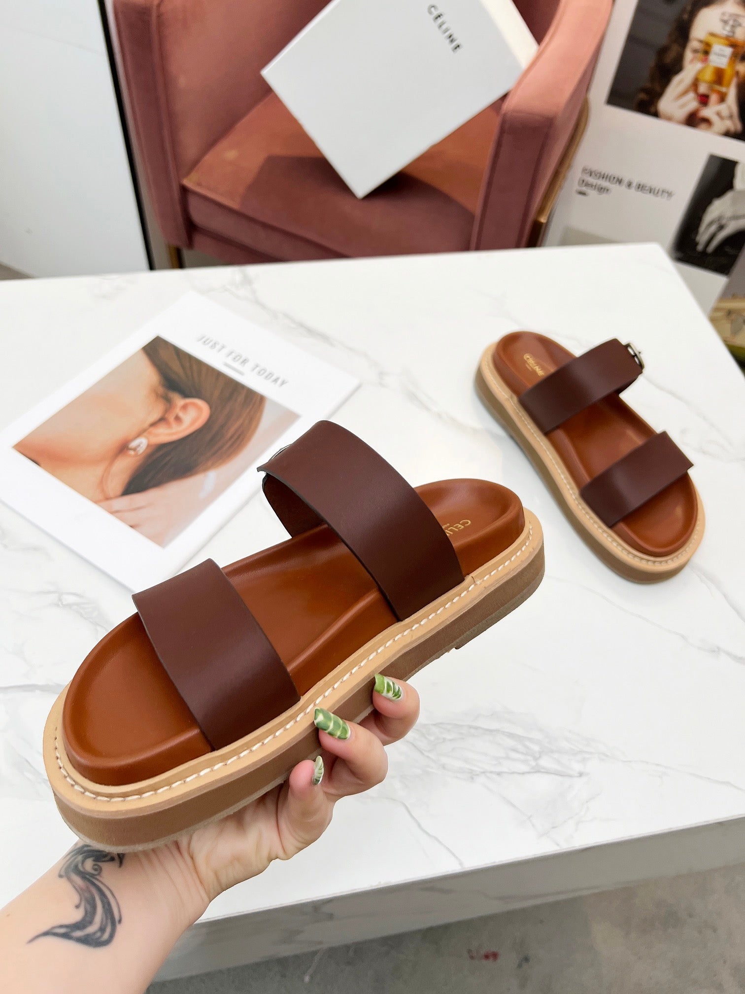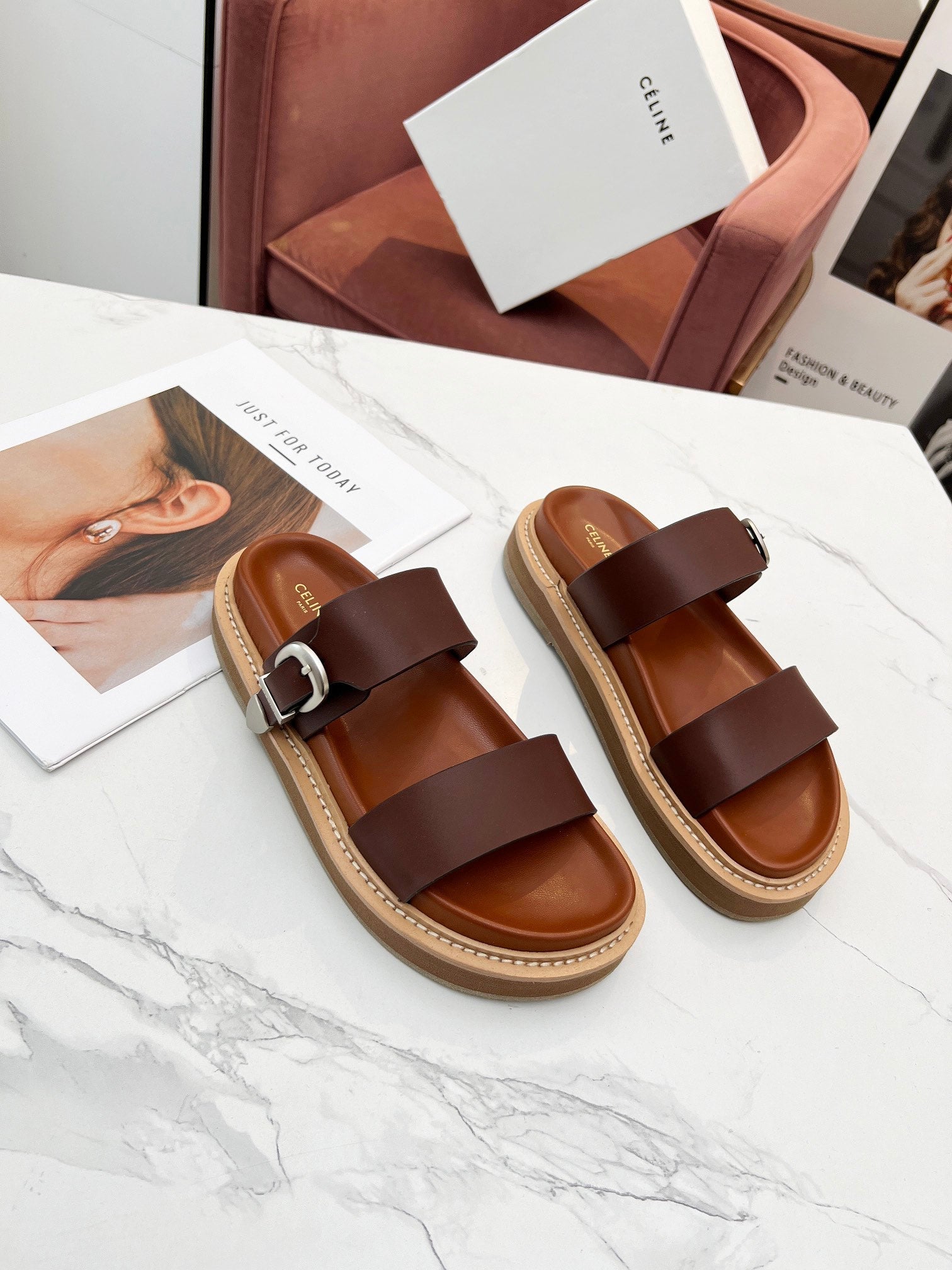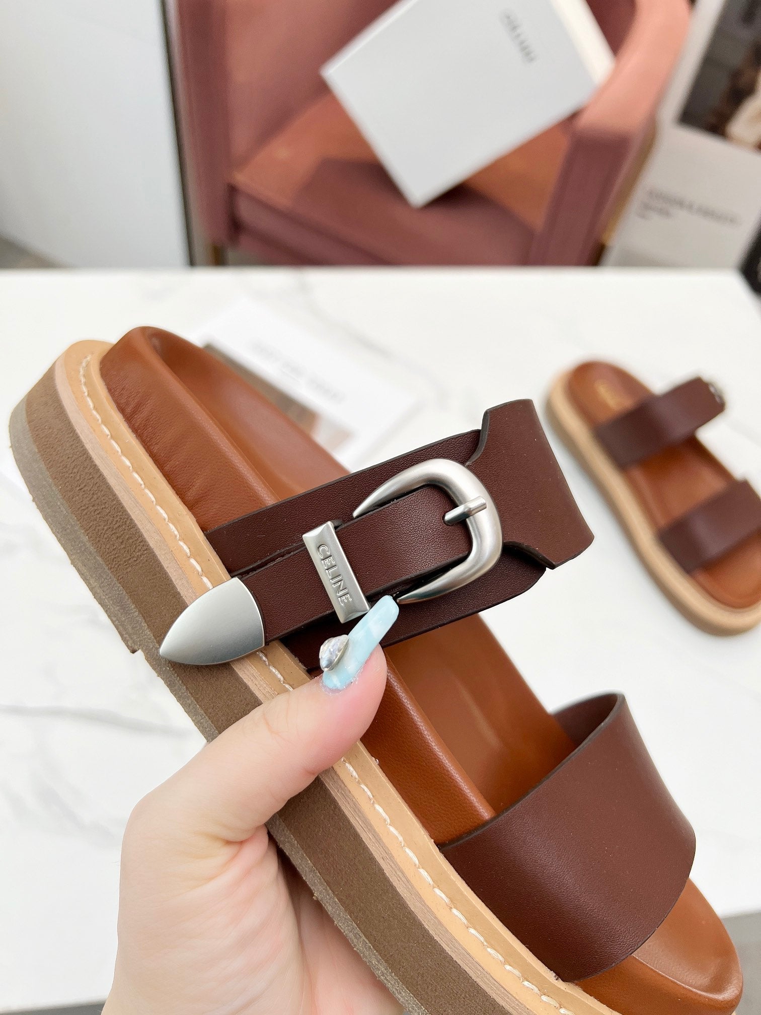 TWO-STRAP SANDALS IN CHESTNUT BROWN CALFSKIN