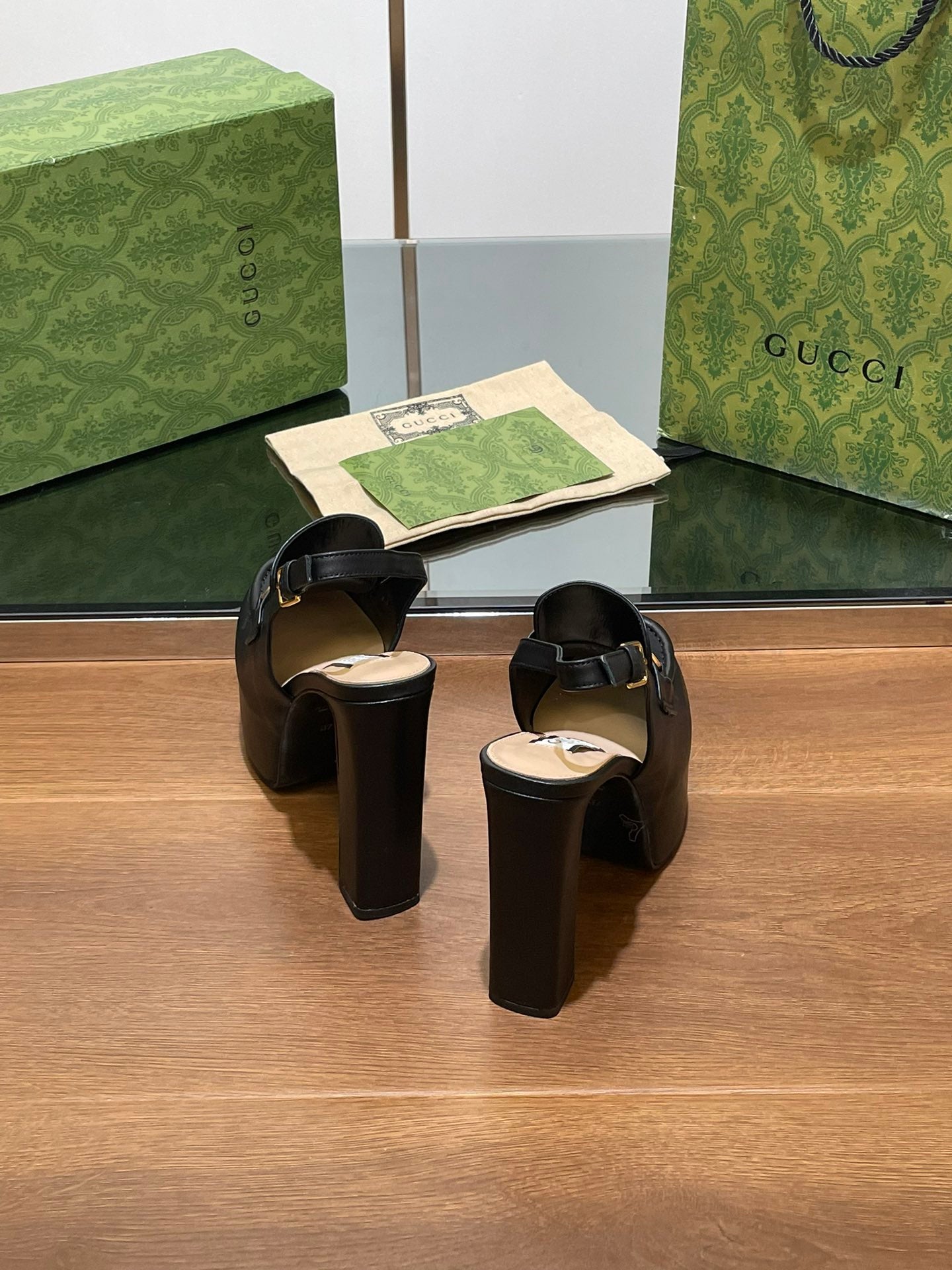 GG WOMEN'S HORSEBIT PLATFORM SLINGBACK IN BLACK CALFSKIN