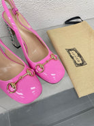 GG WOMEN'S HORSEBIT SLINGBACK 95MM IN FUSICA PINK CALFSKIN WITH RHINSTONES