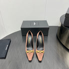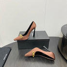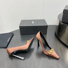 HIGH PUMPS IN TOFFEE BROWN SILK ATTACHED GOLD CHAIN