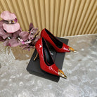 ORANGE GEM-STUDDED HIGH PUMPS IN RED PATENT CALFSKIN