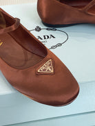 PRA NAPPA MARY JANE FLAT BROWN SATIN