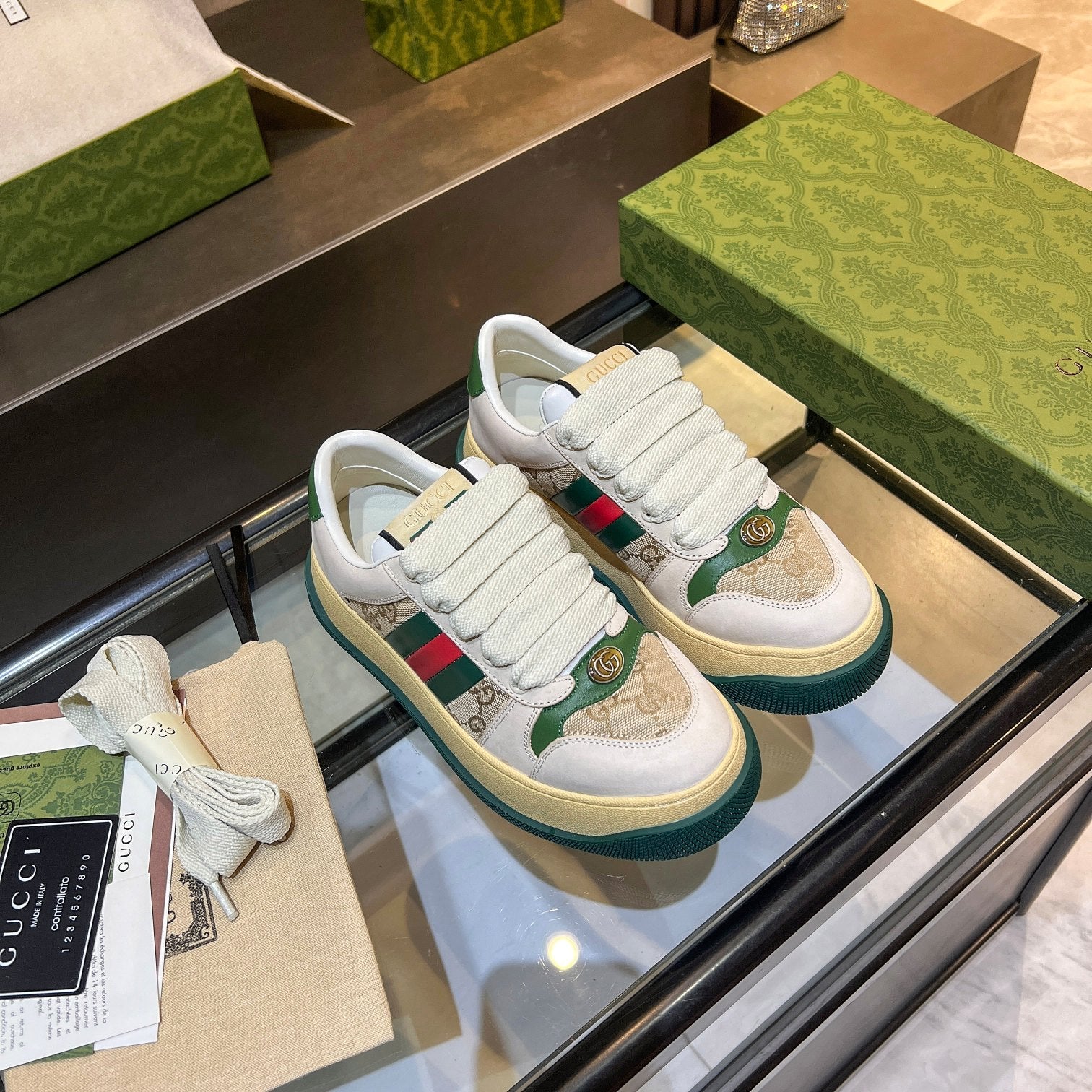 GG Men's Screener Sneaker Brown Green Canvas Sheepskin 523604