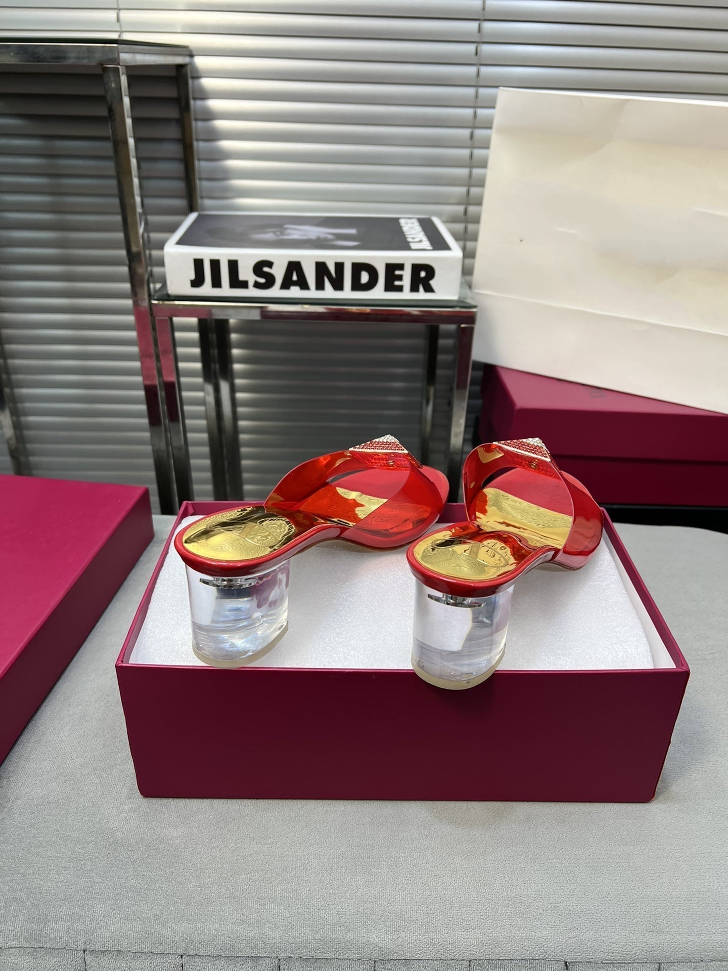 Heeled Sandals 6cm with Crystal Square Buckle Gold and Red