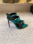 MARTHA POINTED OPEN-TOE HIGH MULES IN TEAL GREEN SILK