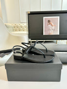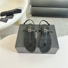 SL Silk Bow T-Strap Flat Sandals Black Leather