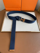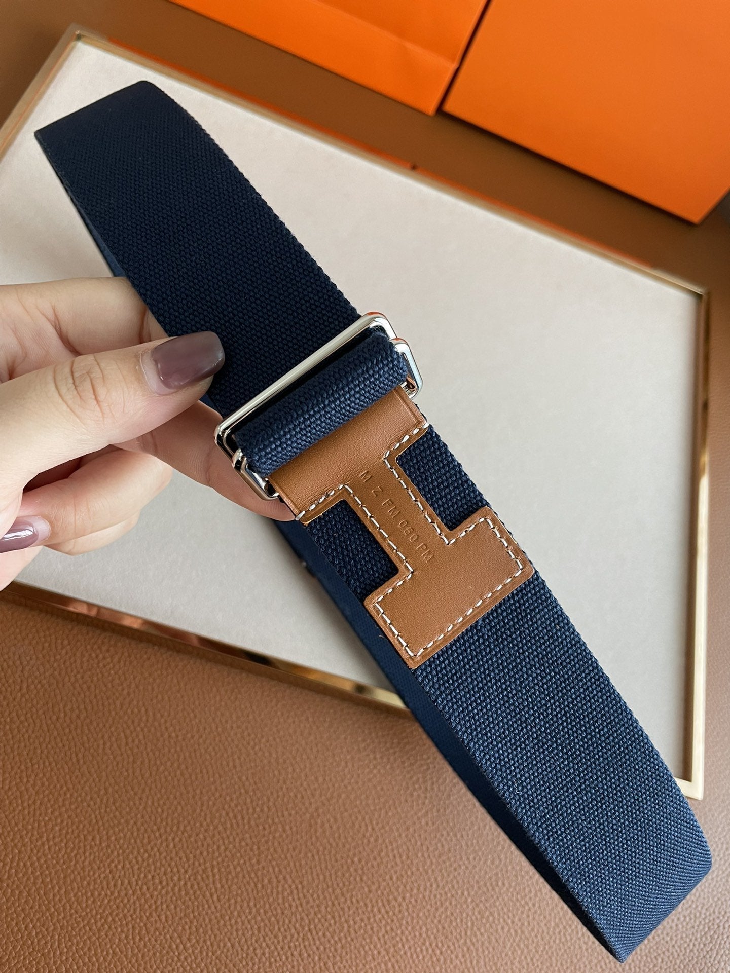 4.0CM BLUE TEXTILE BROWN LEATHER H BELT