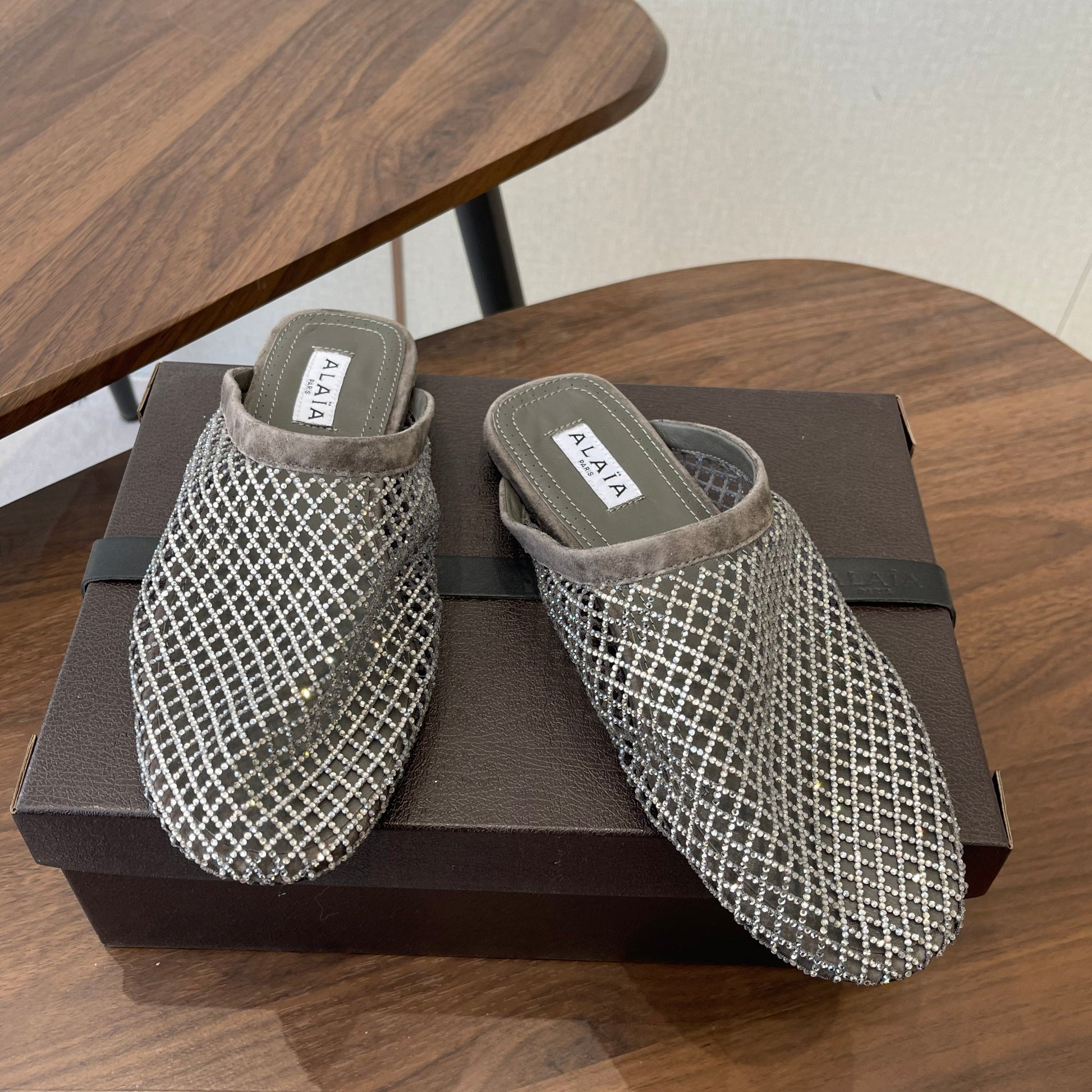 Alaia 26 Half-Slippers Gray Mesh Rhinestones 624898