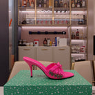 BOW-EMBELLISHED HIGH MULES IN HOT PINK SHEEPSKIN