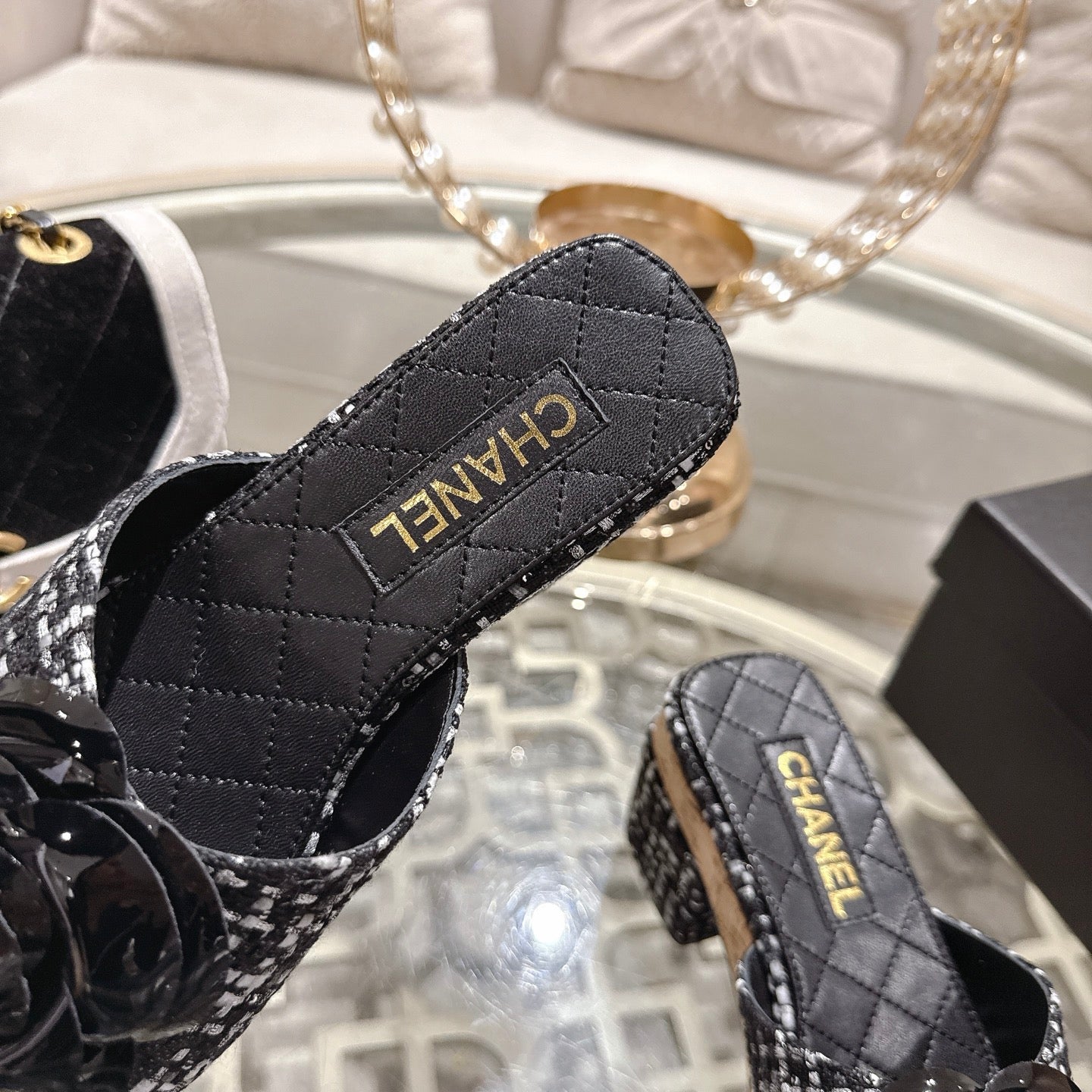 CC 26s Camellia Platform Slippers 65 Black White Tweed Leather 627055
