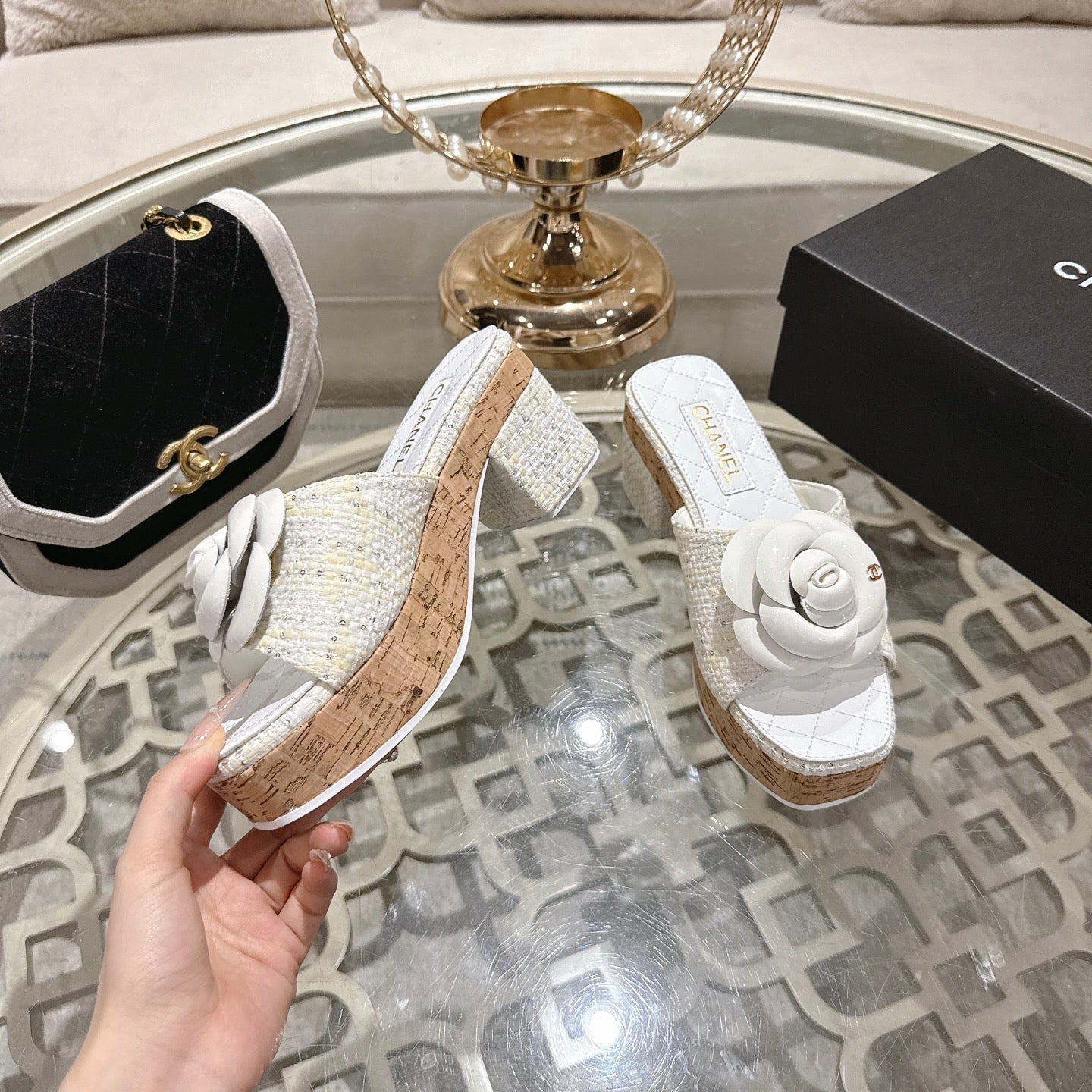 CC 26s Camellia Platform Slippers 65 White Tweed Leather 627054