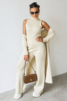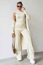 Le débardeur ajusté apporte une touche de modernité, tandis que les pantalons à jambes larges et le cardigan long à ouverture frontale créent une silhouette fluide et épurée. Que vous passiez une journée décontractée ou assistiez à un dîner, cet ensemble s’adapte avec élégance à toutes les occasions.