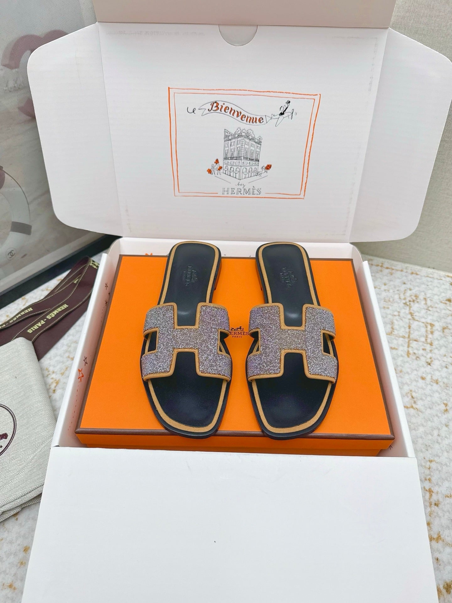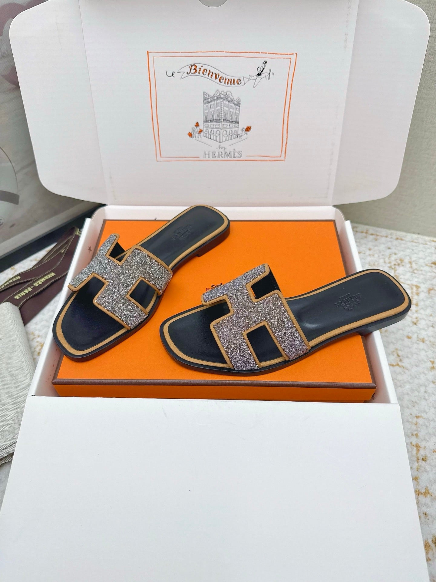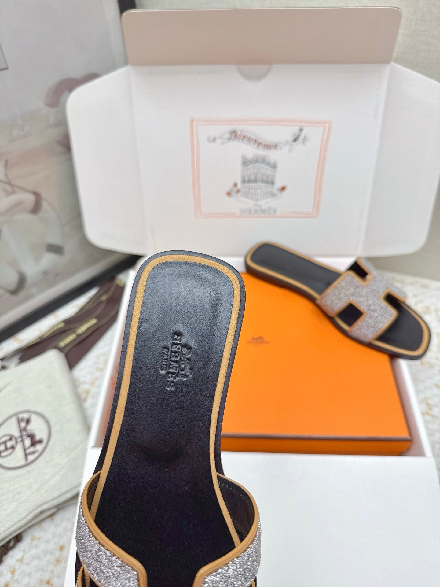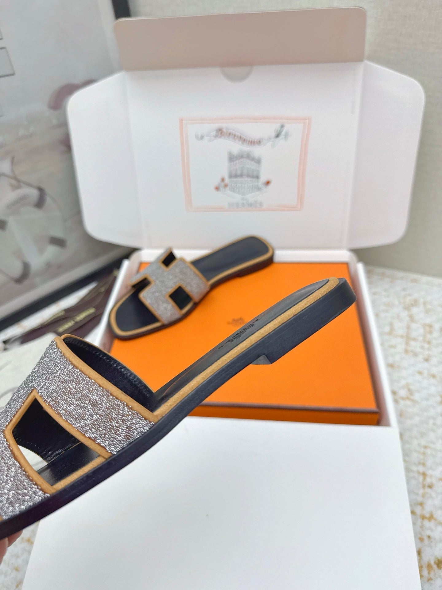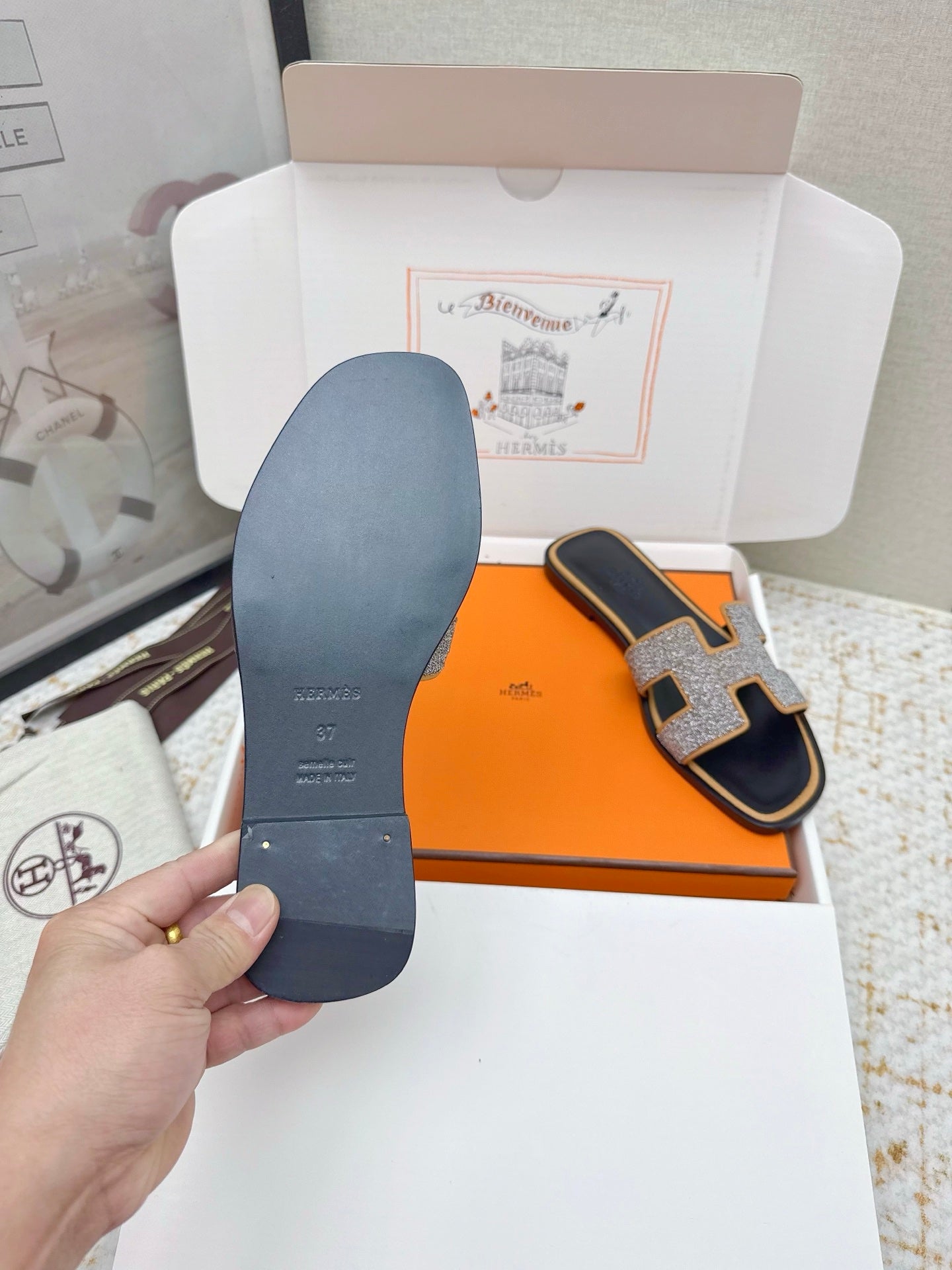 HM 26ss Oran Sandals Black Beige Gray Rhinestone Cowhide 625261