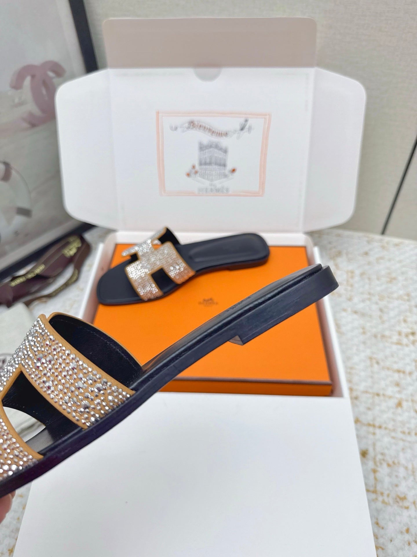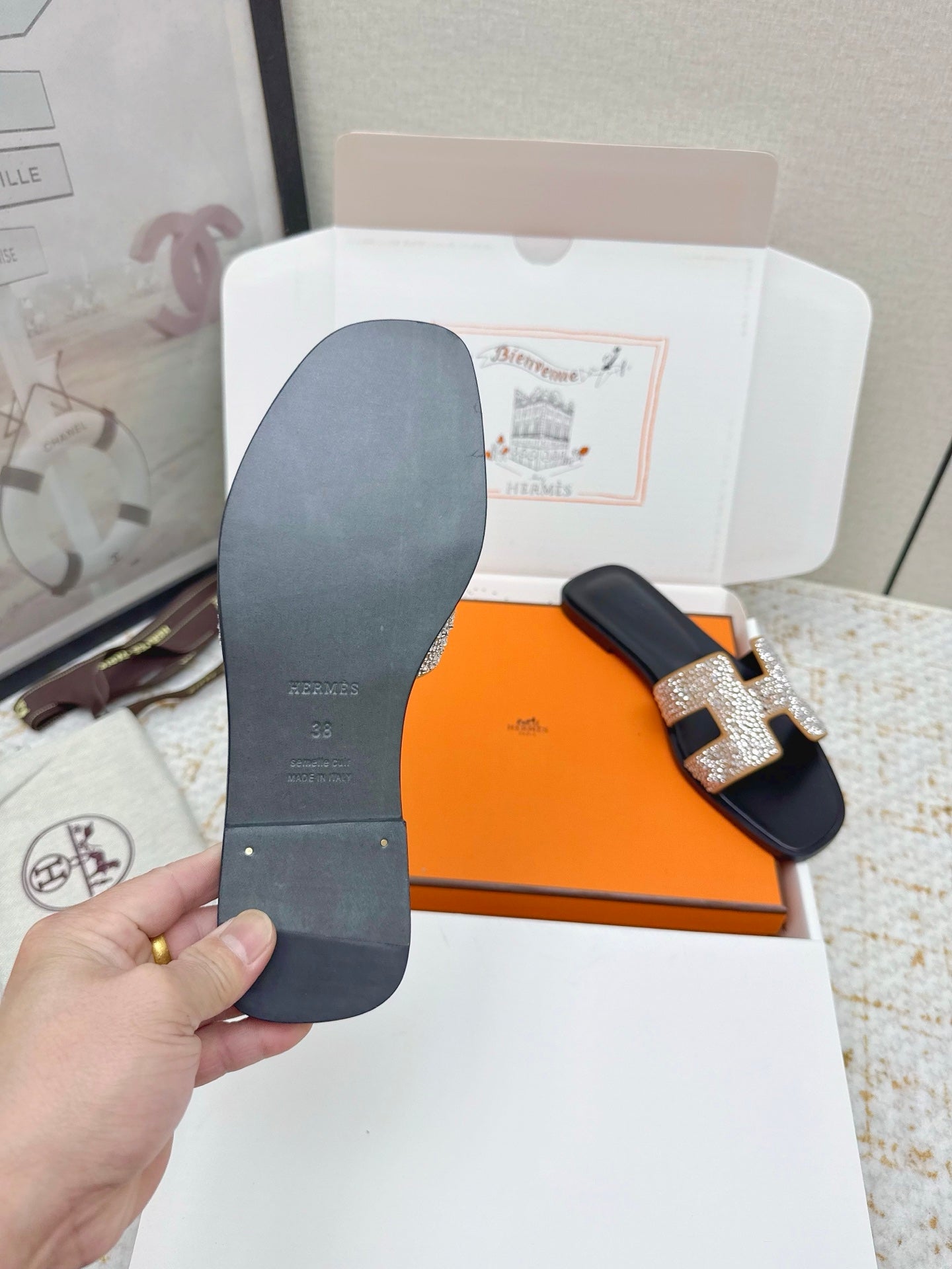 HM 26ss Oran Sandals Black Gold Crystal Cowhide 625248