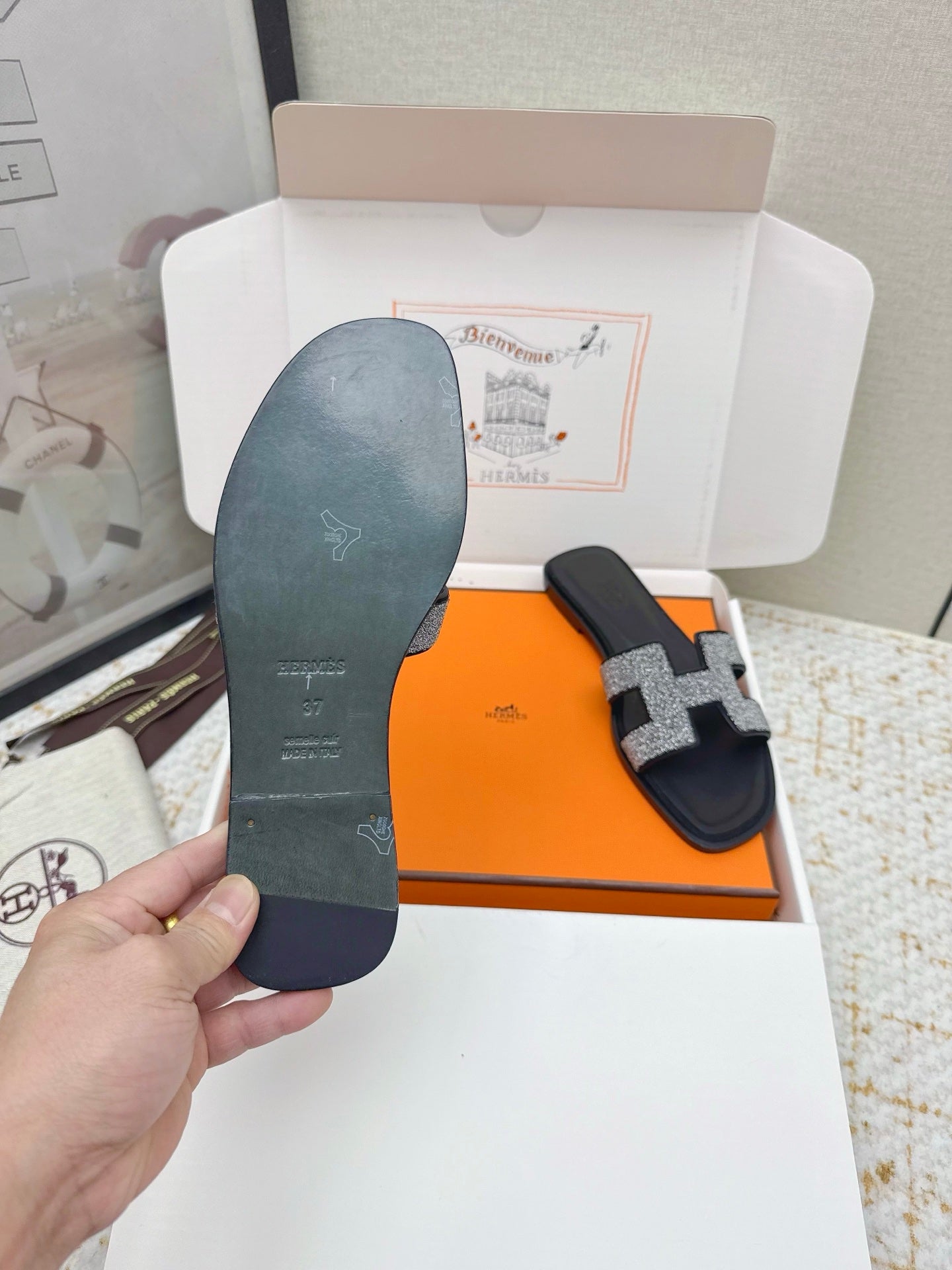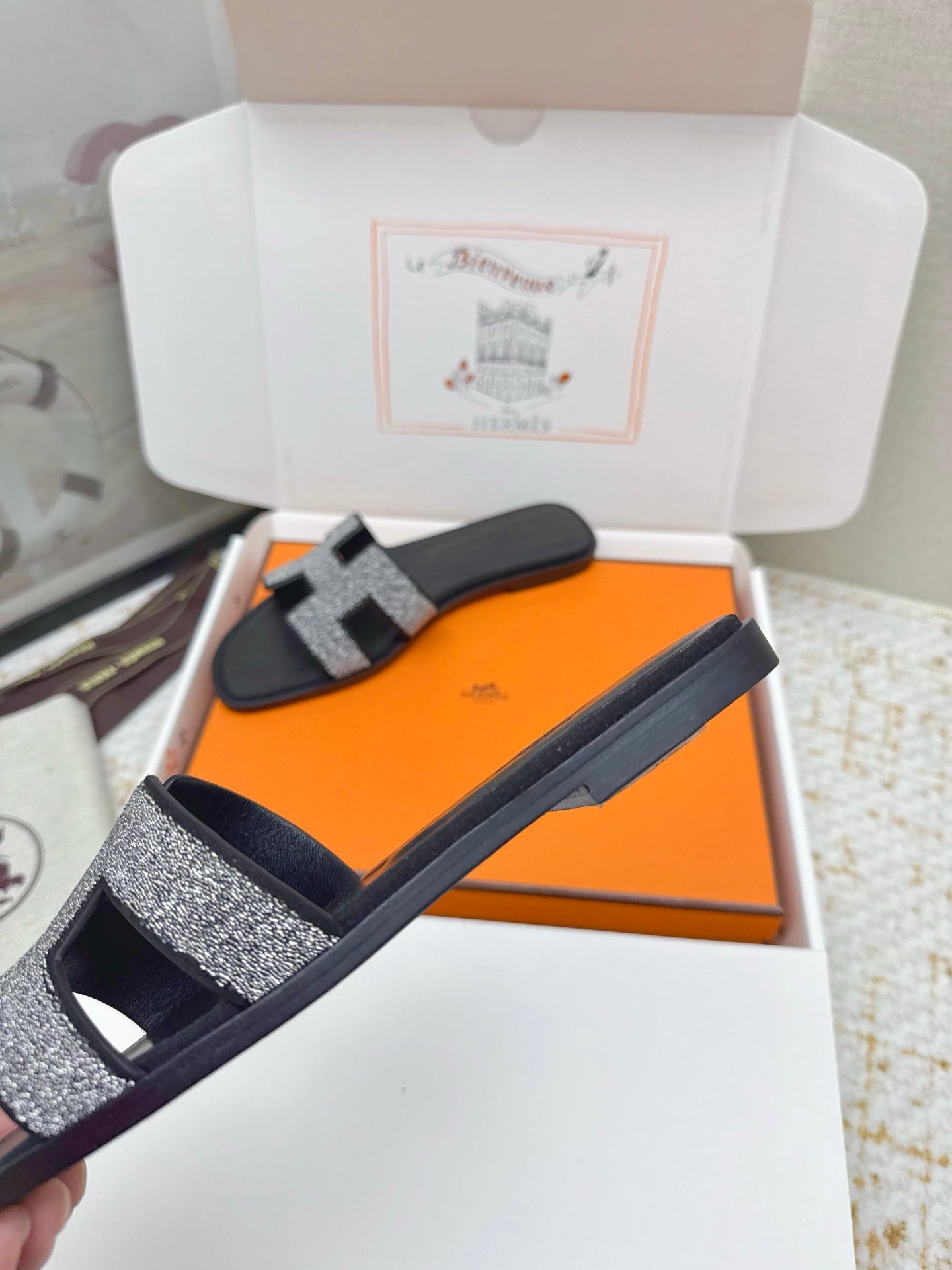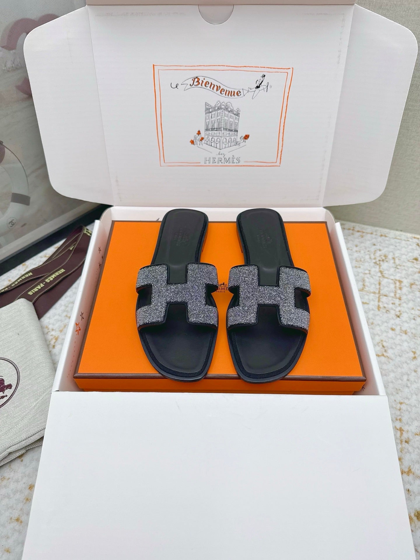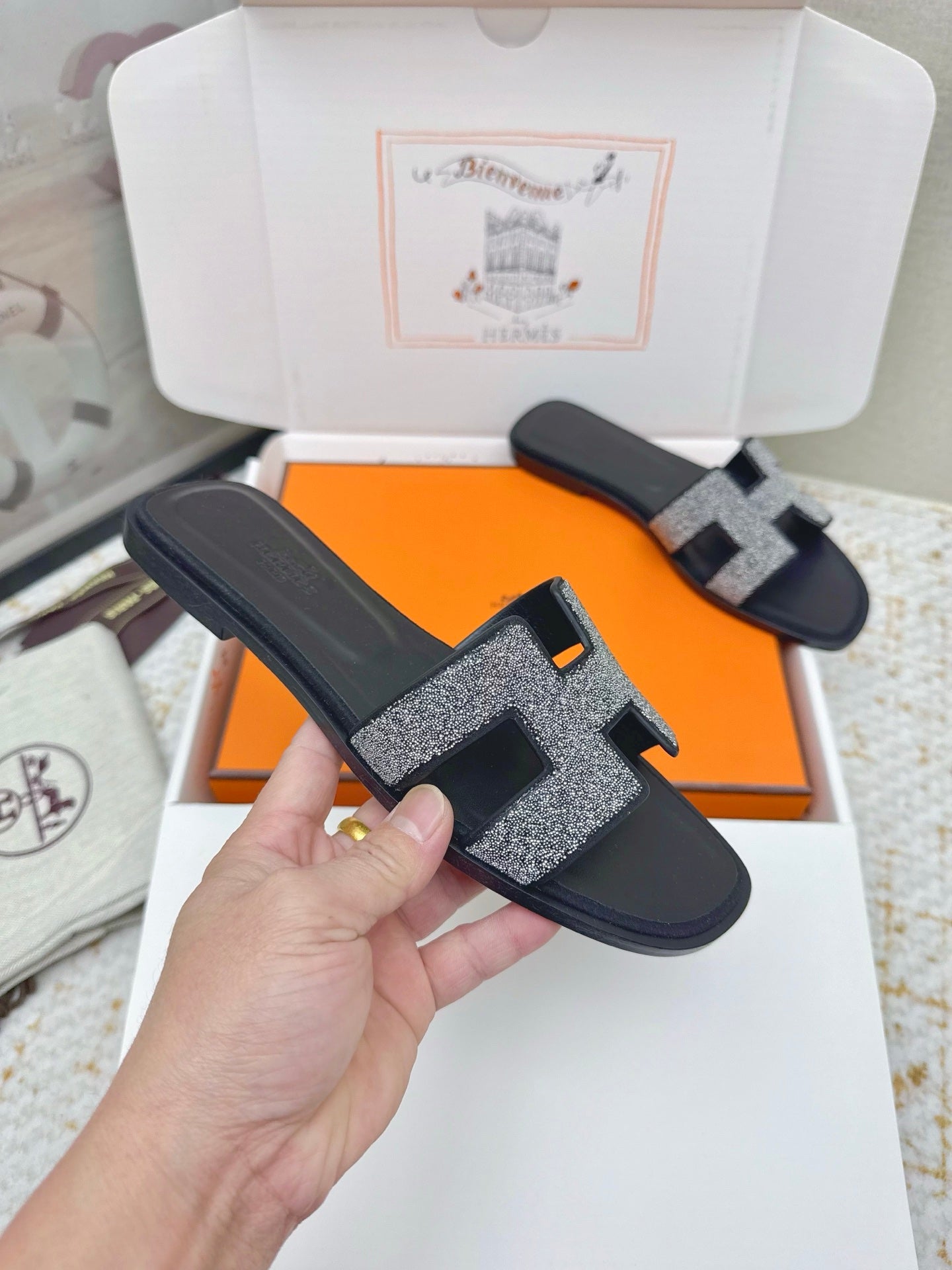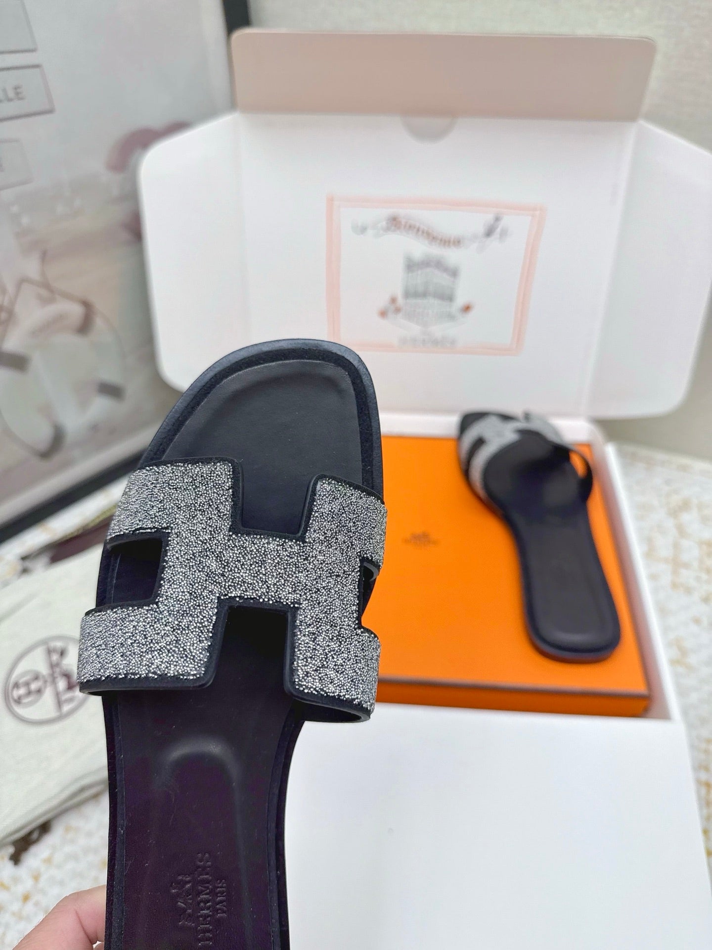 HM 26ss Oran Sandals Black Rhinestone Cowhide 625260