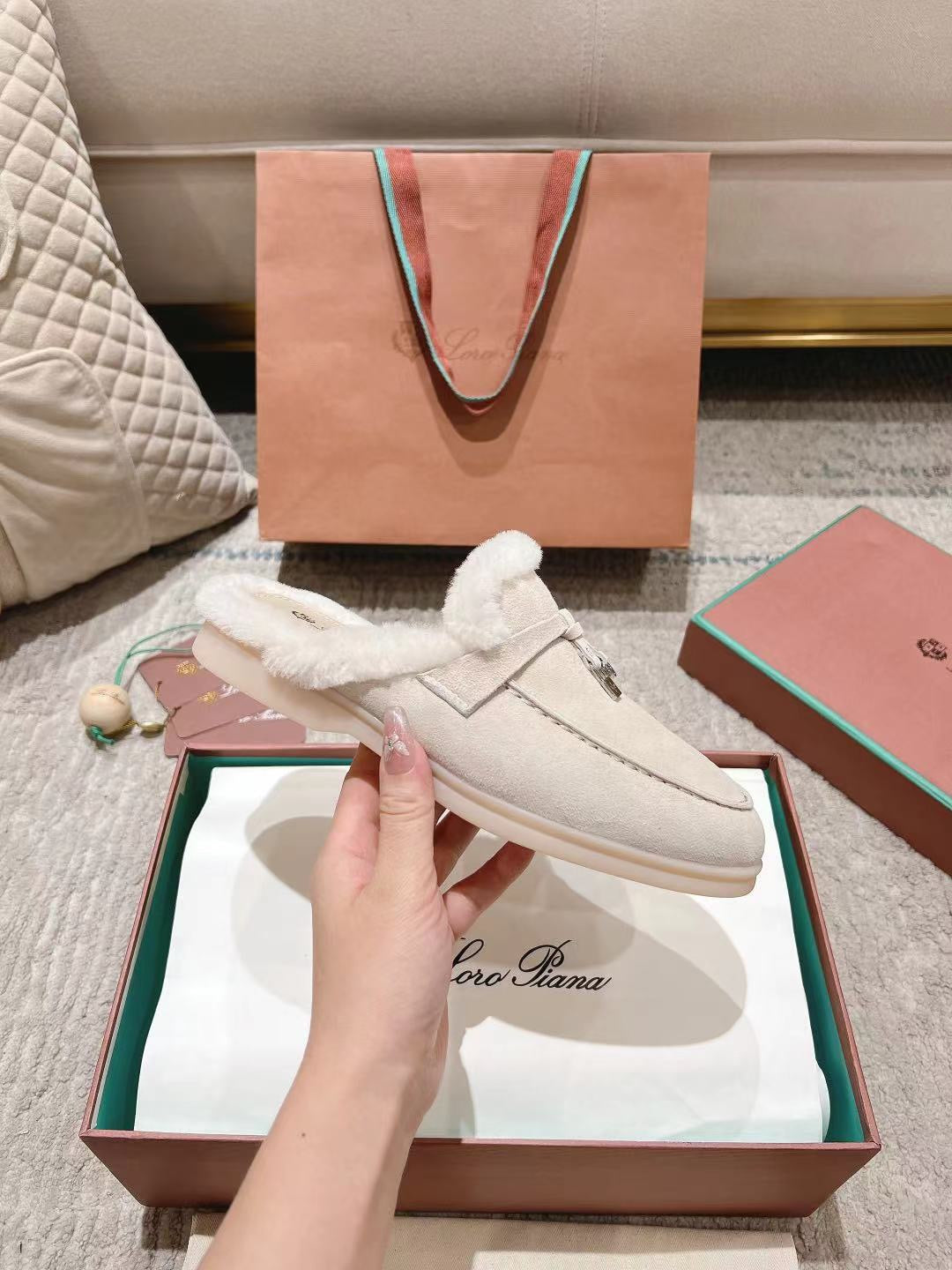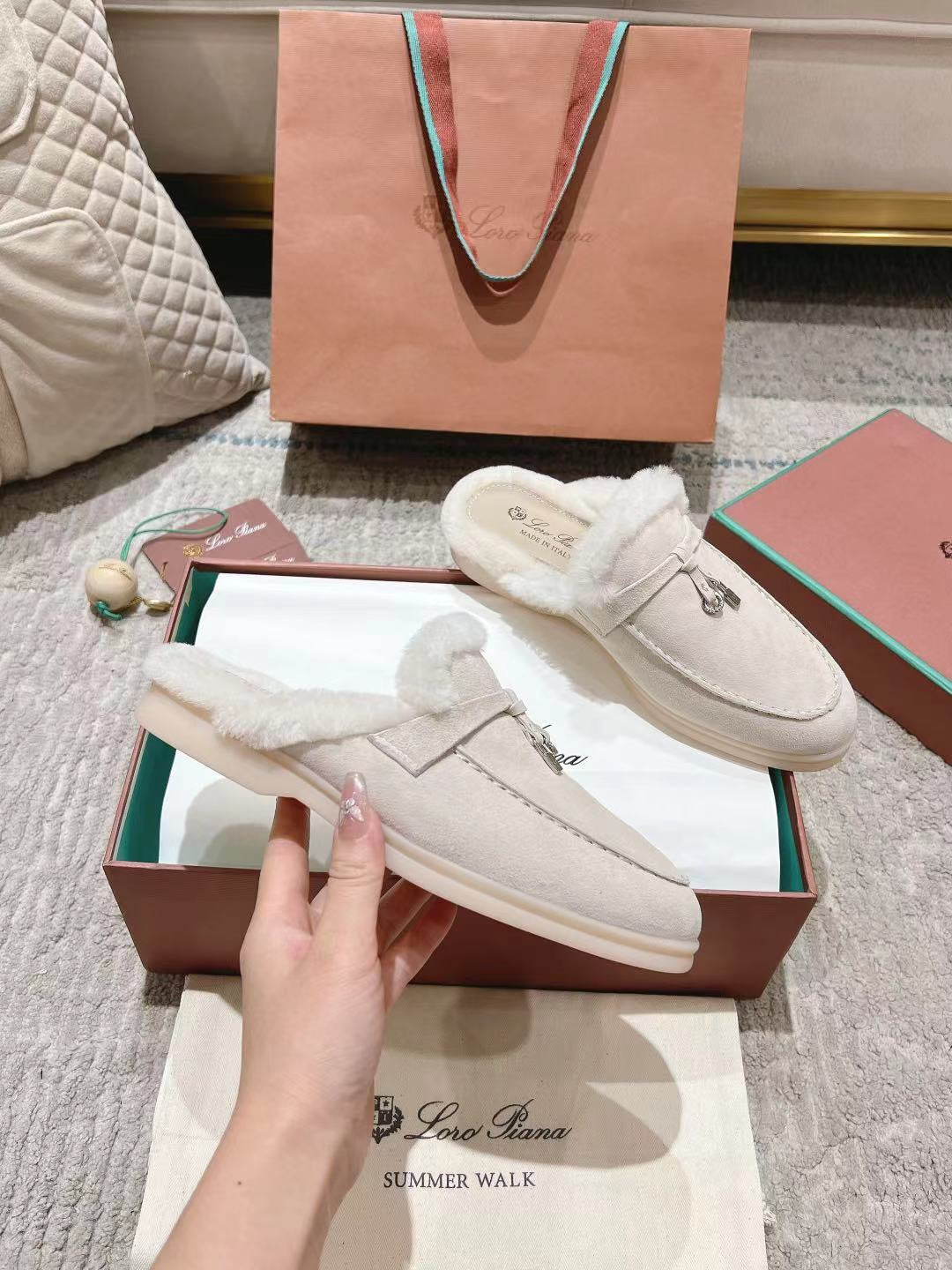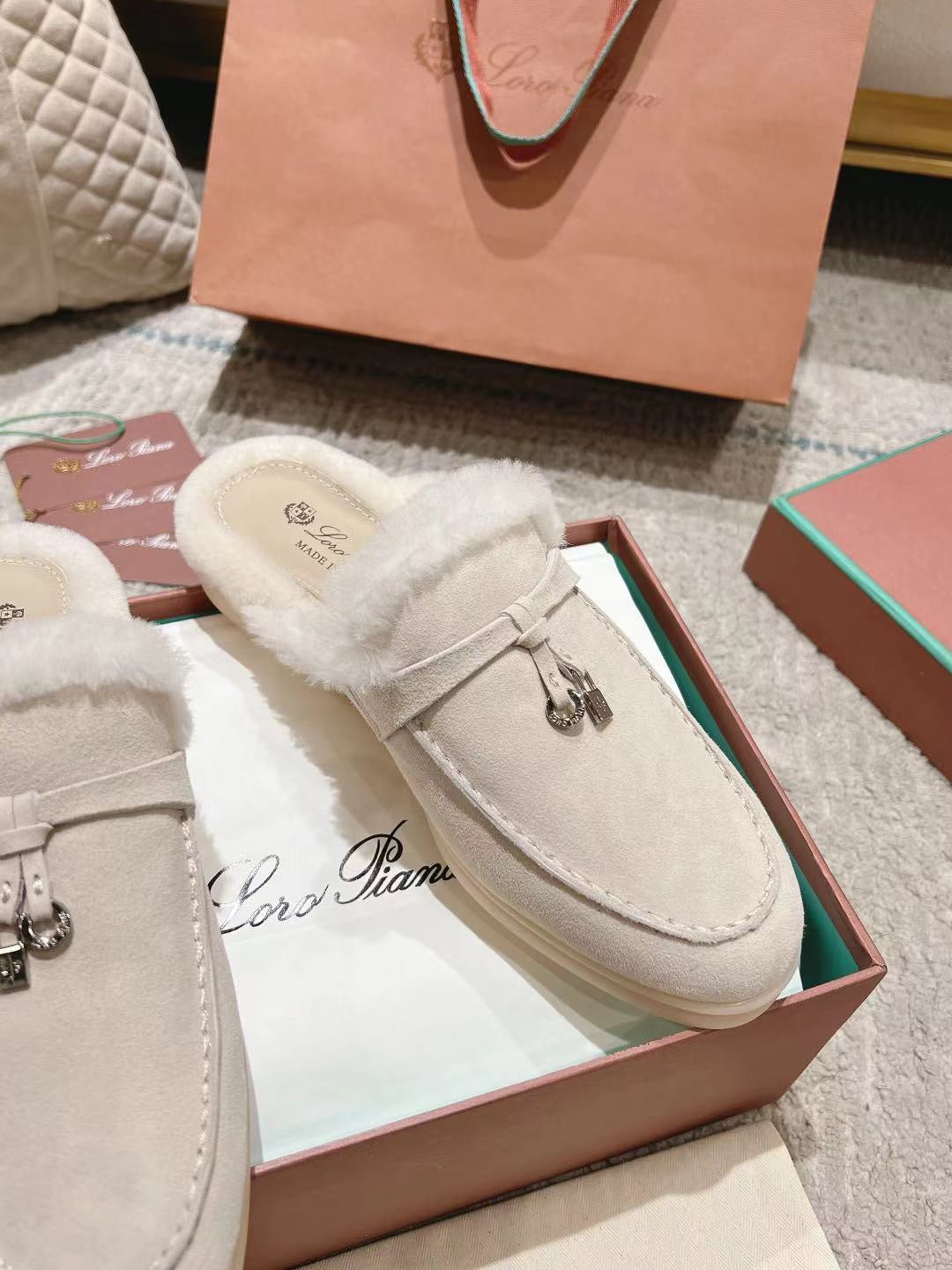 LP Charms Walk Babouche Loafer White Suede With Rabbit Fur Lining 206231