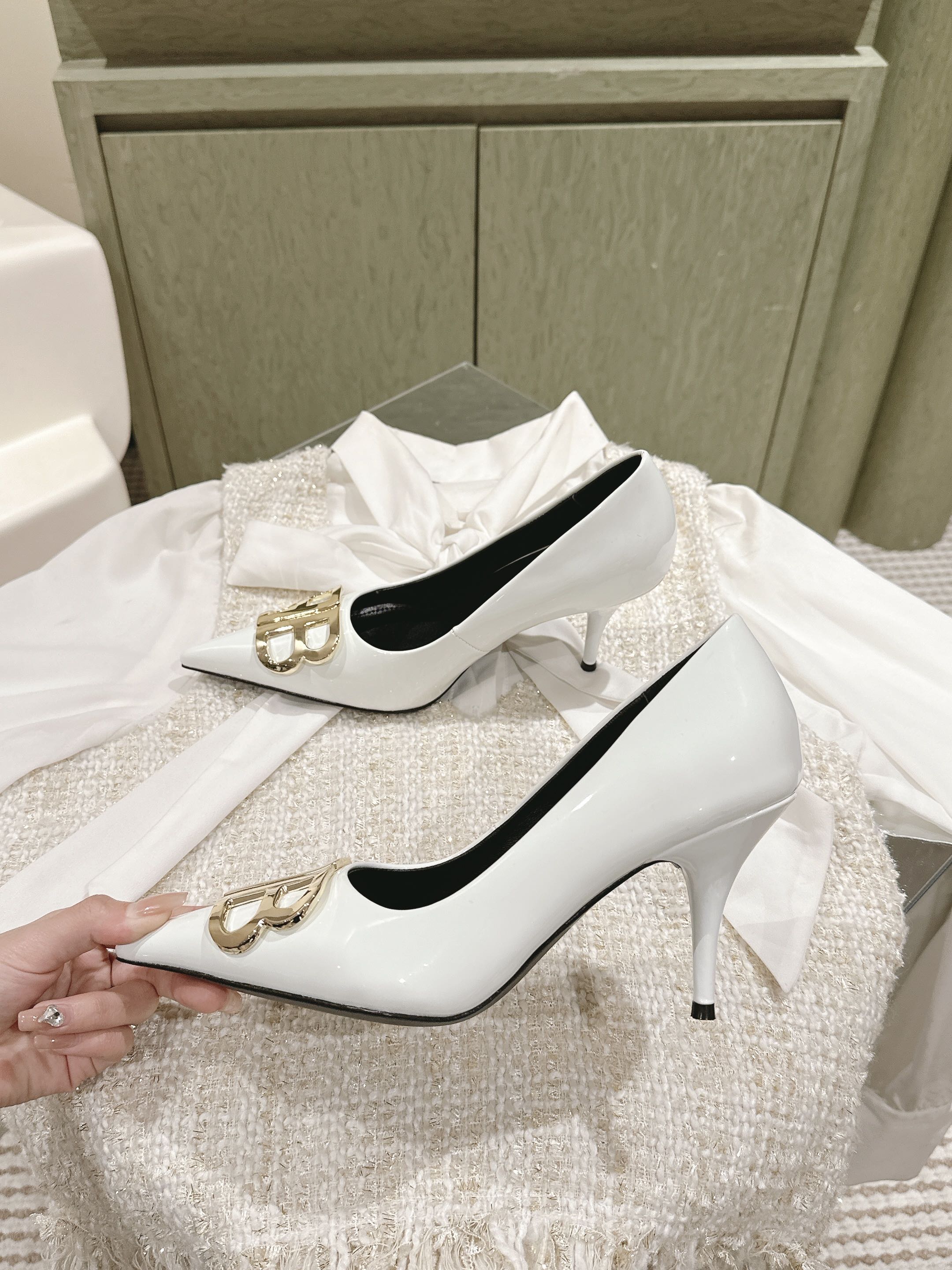 POINTED BB GOLD BUCKLE HIGH PUMPS 85MM IN WHITE PATENT CALFSKIN