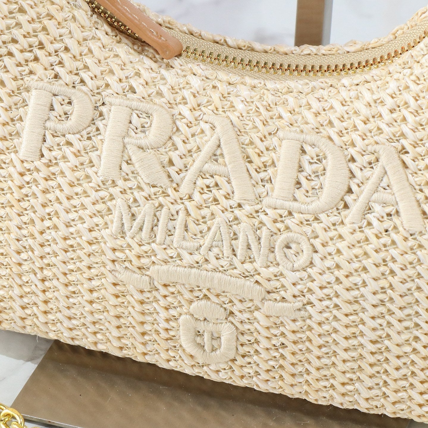 PRA 22 BAG IN BEIGE RAFFIA AND BROWN CALFSKIN GOLD HARDWARE